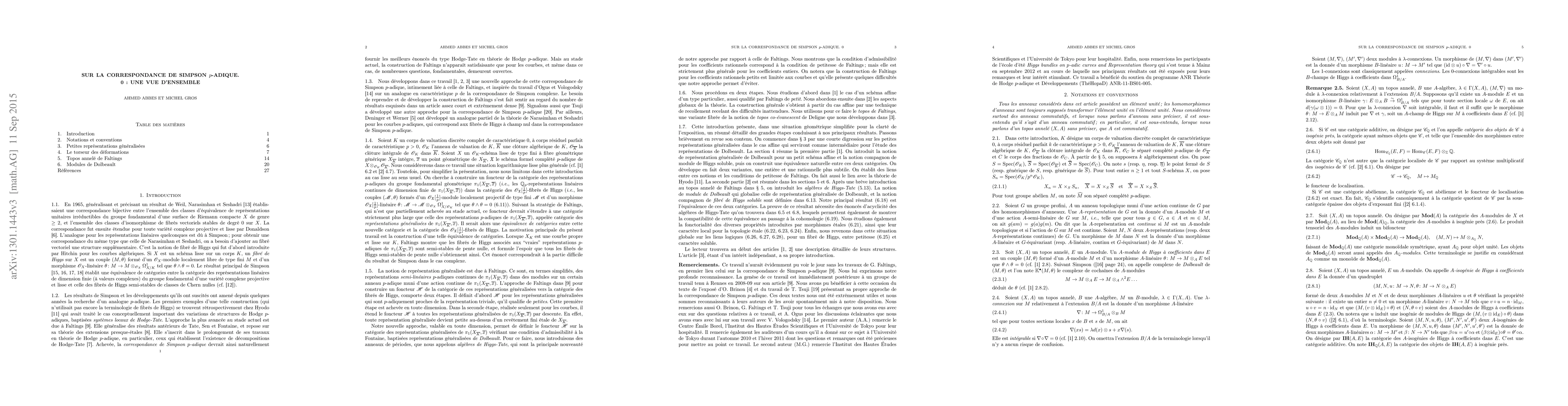 We develop a new approach for the p-adic Simpson correspondence, closely related to the original approach of Faltings, but also inspired by the work of Ogus and Vologodsky on an analogue in characteristic p>0. The aim of this article is to give an extensive overview of the theory that has been developped in two articles, the first one (arXiv:1102.5466) devoted to the local aspects and the second one (arXiv:1301.0904) to the global aspects.