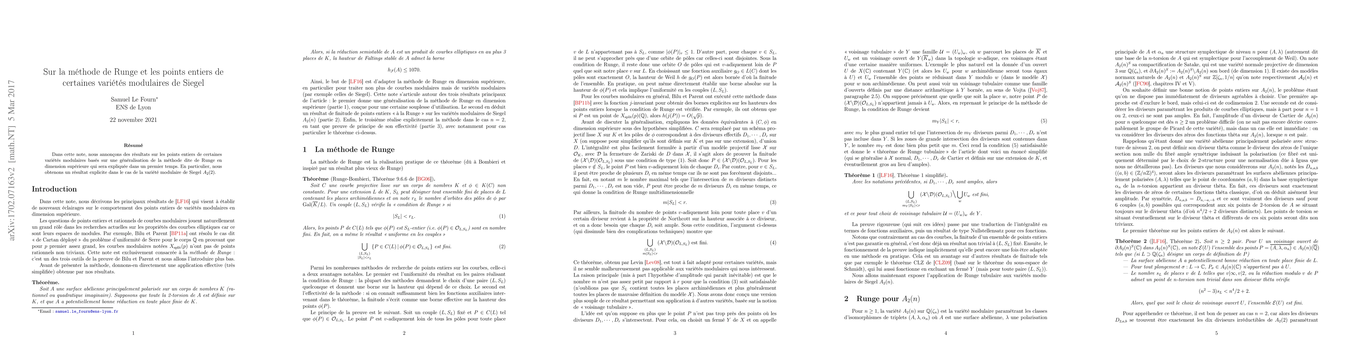 In this note, we announce results on integral points on some modular varieties, based on a generalisation of Runge's method in higher dimensions which will be explained beforehand. In particular, we obtain an explicit result in the case of the Siegel modular variety $A_2(2)$.