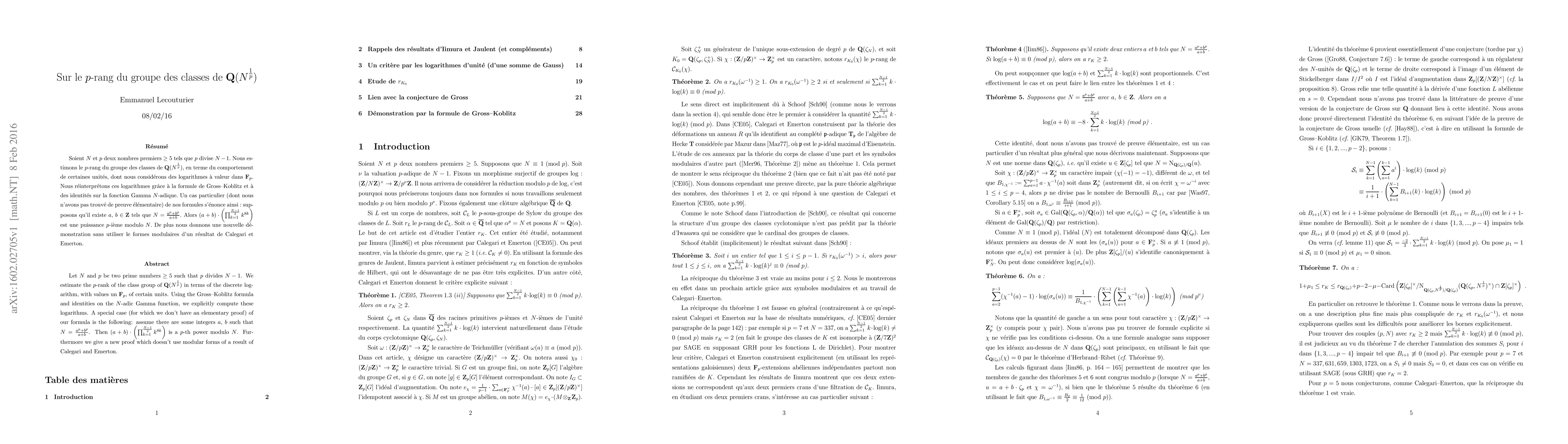Let N and p be two prime numbers > 3 such that p divides N-1. We estimate the p-rank of the class group of Q(N^(1/p)) in terms of the discrete logarithm, with values un F_p, of certain units. Using the Gross--Koblitz formula and identities on the N-adic Gamma function, we explicitly compute these logarithms. A special case (for which we don't have an elementary proof) of our formula is the following: assume there are some integers $a$, $b$ such that N = (a^p+b^p)/(a+b). Then (a+b)*\prod_{k=1}^{(N-1)/2} k^{8k} is a p-th power modulo N. Furthermore we give a new proof which doesn't use modular forms of a result of Calegari and Emerton.