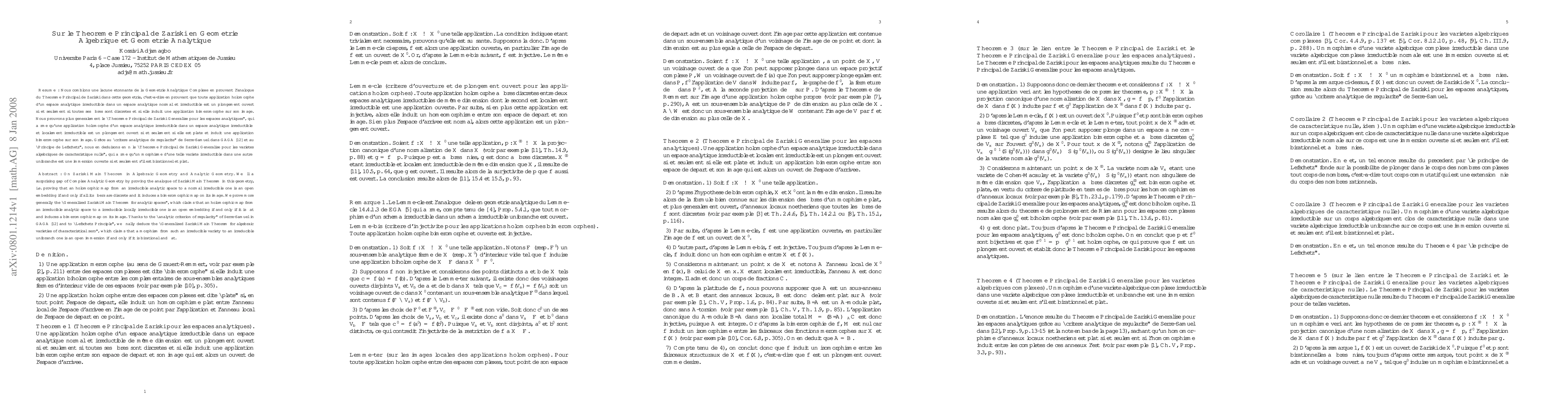 On Zariski Main Theorem in Algebraic Geometry and Analytic Geometry. We fill a surprising gap of Complex Analytic Geometry by proving the analogue of Zariski Main Theorem in this geometry, i.e. proving that an holomorphic map from an irreducible analytic space to a normal irreducible one is an open embedding if and only if all its fibers are discrete and it induces a bimeromorphic map on its image. We prove more generally the "Generalized Zariski Main Theorem for analytic spaces", which claims that an holomorphic map from an irreducible analytic space to a irreducible locally irreducible one is an open embedding if and only if it is flat and induces a bimeromorphic map on its image. Thanks to the "analytic criterion of regularity" of Serre-Samuel in GAGA [12] and to "Lefschetz Principle", we finally deduce the "Generalized Zariski Main Theorem for algebraic varieties of characteristical zero", which claims that a morphism from such an irreducible variety to an irreducible unibranch one is an open immersion if and only if it is birational and flat. ----- Nous comblons une lacune \'etonnante de la G\'eom\'etrie Analytique Complexe en prouvant l'analogue du Th\'eor\`eme Principal de Zariski dans cette g\'eom\'etrie, c'est-\`a-dire en prouvant que toute application holomorphe d'un espace analytique irreductible dans un espace analytique normal et irreductible est un plongement ouvert si et seulement si toutes ses fibres sont discr\`etes et si elle induit une application bim\'eromorphe sur son image. Nous prouvons plus g\'en\'eralement le ``Th\'eor\`eme Principal de Zariski G\'en\'eralis\'e pour les espaces analytiques'', qui affirme qu'une application holomorphe d'un espace analytique irreductible dans un espace analytique irreductible et localement irreductible est un plongement ouvert si et seulement si elle est plate et induit une application bim\'eromorphe sur son image. Gr\^ace au ``crit\^ere analytique de r\'egularit\'e'' de Serre-Samuel dans GAGA \cite{serre} et au ``Principe de Lefschetz'', nous en d\'eduisons enfin le ``Th\'eor\`eme Principal de Zariski G\'en\'eralis\'e pour les vari\'et\'es alg\'ebriques de caract\'eristique nulle'', qui affirme qu'un morphisme d'une telle vari\'et\'e irreductible dans une autre unibranche est une immersion ouverte si et seulement s'il est birationnel et plat.