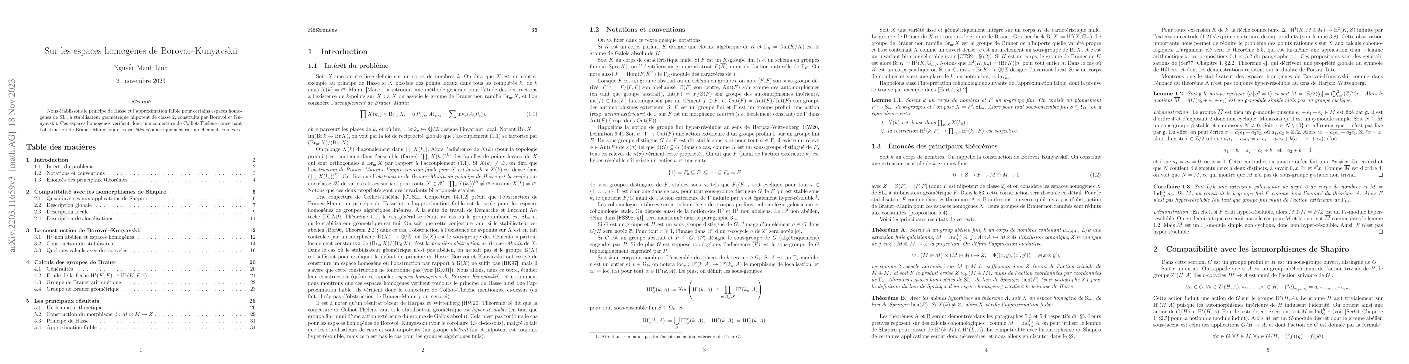 We establish the Hasse principle and the weak approximation property for certain homogeneous spaces of $\mathrm{SL}_n$ whose geometric stabilizer is of nilpotency class 2, which were constructed by Borovoi and Kunyavski\u{\i}. These homogeneous spaces verify thus a conjecture of Colliot-Th\'el\`ene concerning Brauer-Manin obstruction for geometrically rationally connected varieties. -- Nous \'etablissons le principe de Hasse et l'approximation faible pour certains espaces homog\`enes de $\mathrm{SL}_n$ \`a stabilisateur g\'eom\'etrique nilpotent de classe 2, construits par Borovoi et Kunyavski\u{\i}. Ces espaces homog\`enes v\'erifient donc une conjecture de Colliot-Th\'el\`ene concernant l'obstruction de Brauer-Manin pour les vari\'et\'es g\'eom\'etriquement rationnellement connexes.