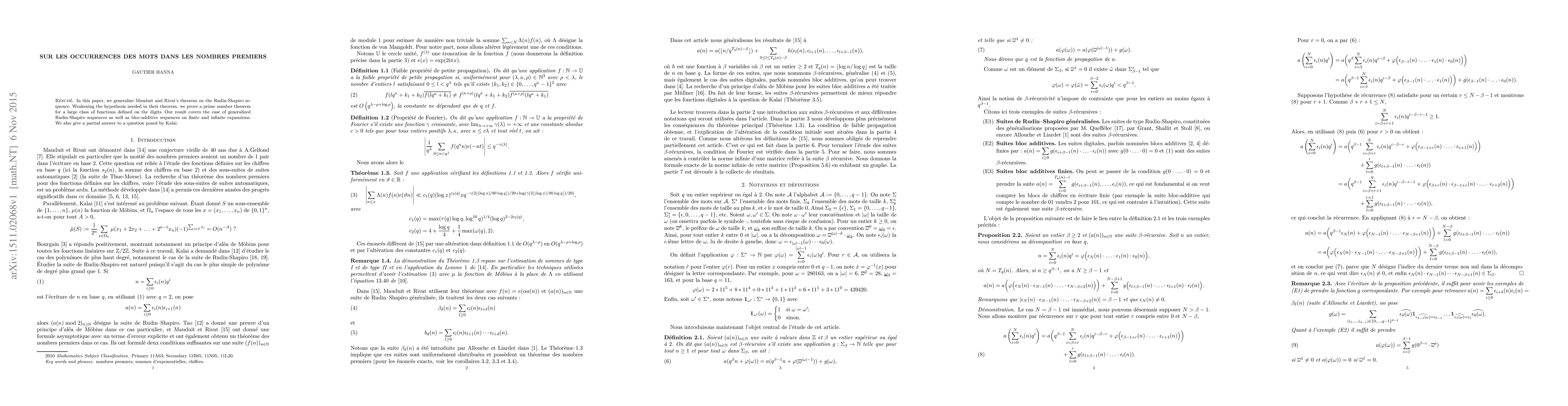 In this paper, we generalize Mauduit and Rivat's theorem on the Rudin-Shapiro sequence. Weakening the hypothesis needed in their theorem, we prove a prime number theorem for a large class of functions defined on the digits. Our result covers the case of generalized Rudin-Shapiro sequences as well as bloc-additive sequences on finite and infinite expansions. We also give a partial answer to a question posed by Kalai.