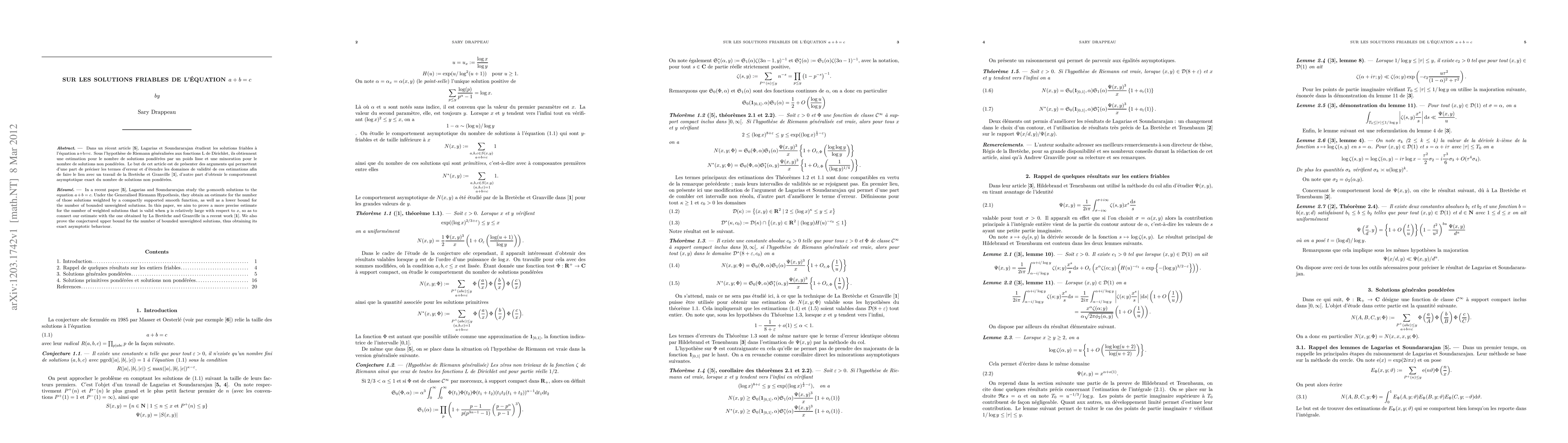 Dans un r\'ecent article, Lagarias et Soundararajan \'etudient les solutions friables \`a l'\'equation a+b=c. Sous l'hypoth\`ese de Riemann g\'en\'eralis\'ees aux fonctions L de Dirichlet, ils obtiennent une estimation pour le nombre de solutions pond\'er\'ees par un poids lisse et une minoration pour le nombre de solutions non pond\'er\'ees. Le but de cet article est de pr\'esenter des arguments qui permettent d'une part de pr\'eciser les termes d'erreur et d'\'etendre les domaines de validit\'e de ces estimations afin de faire le lien avec un travail de la Bret\`eche et Granville, d'autre part d'obtenir le comportement asymptotique exact du nombre de solutions non pond\'er\'ees. In a recent paper, Lagarias and Soundararajan study the y-smooth solutions to the equation a+b=c. Under the Generalised Riemann Hypothesis, they obtain an estimate for the number of those solutions weighted by a compactly supported smooth function, as well as a lower bound for the number of bounded unweighted solutions. In this paper, we aim to prove a more precise estimate for the number of weighted solutions that is valid when y is relatively large with respect to x, so as to connect our estimate with the one obtained by La Bret\`eche and Granville in a recent work. We also prove the conjectured upper bound for the number of bounded unweighted solutions, thus obtaining its exact asymptotic behaviour.