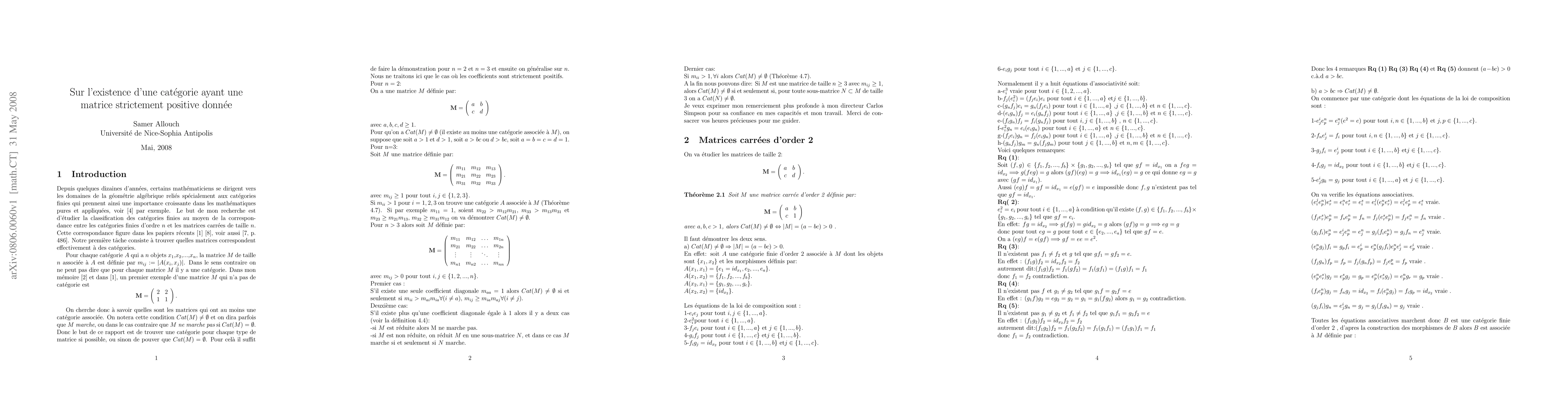 The Leinster matrix corresponding to a finite category has entries counting the number of morphisms between objects. A first question is to know which positive integer matrices come from at least one finite category. Here, that question will be answered when the entries are strictly positive.
