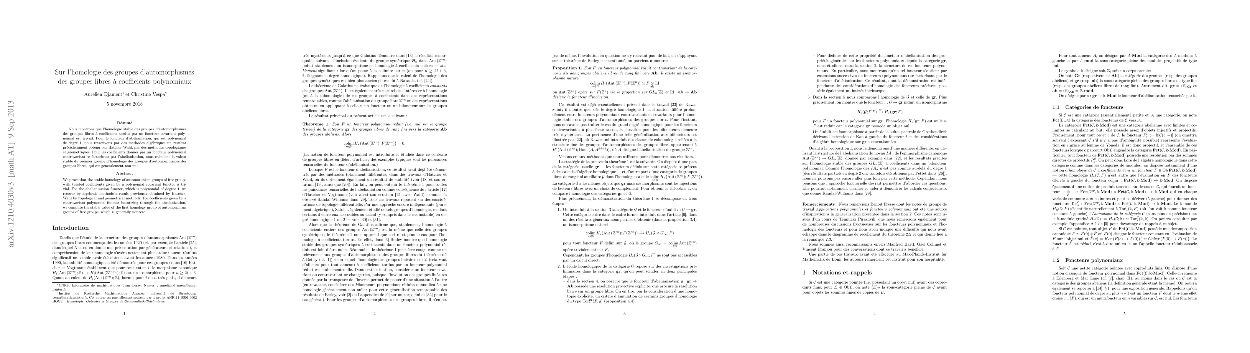 We study in this article stable homology of automorphism groups of free groups with coefficients twisted by a poynomial functor. We show that this homology is zero for a reduced covariant polynomial functor. For a reduced contravariant functor, we compute the first homology group, which is in general non zero. Our methods relie on the use of functor categories. ---On \'etudie dans cet article l'homologie stable des groupes d'automorphismes des groupes libres \`a coefficients tordus par un foncteur polynomial. On montre que cette homologie est nulle pour un foncteur polynomial covariant r\'eduit. Dans le cas d'un foncteur polynomial r\'eduit contravariant, on calcule le premier groupe d'homologie, qui n'est g\'en\'eralement pas nul. Nos m\'ethodes reposent sur l'utilisation de cat\'egories de foncteurs.