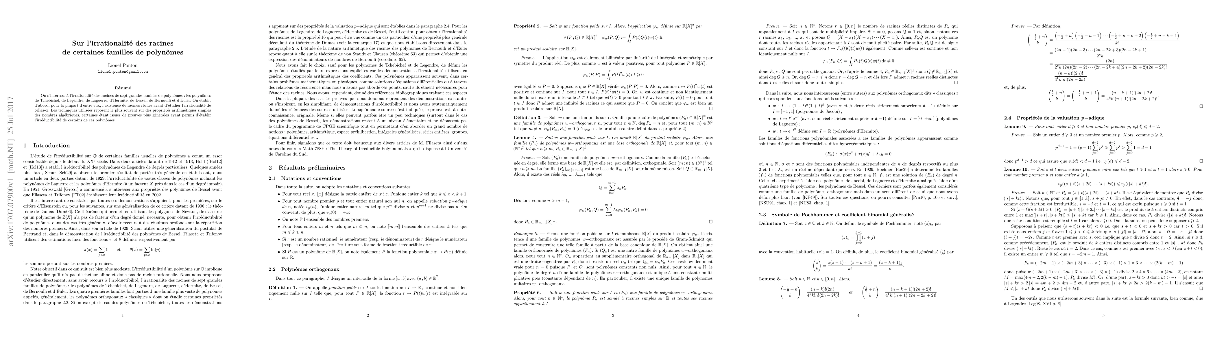 We are interested in irrationality of roots for seven important families of polynomials : Tchebichef polynomials, Legendre polynomials, Laguerre polynomials, Hermite polynomials, Bessel polynomials, Bernoulli polynomials and Euler polynomials. One first proves, for the most part of them, existence of real roots then one studies the irrationality of them. The methods used are based on elementary arithmetical properties of algebraic numbers, some of them becoming from more general proofs that have allowed to derive the irreducibility of some of these polynomials.