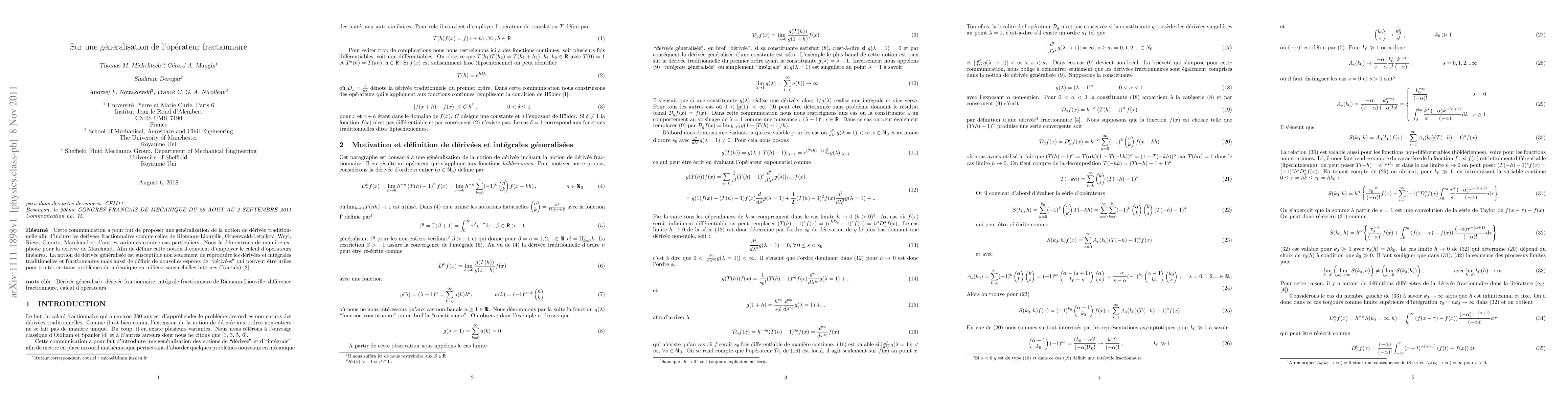 The goal of this communication is to propose a generalized notion of the "traditional derivative". This generalization includes the fractional derivatives such as the Riemann-Liouville, Gruenwald-Letnikov, Weyl, Riesz, Caputo, Marchaud derivatives and other variants as special cases. The approach is useful to describe mechanical problems in material systems with microstructures without characteristic scale such as self-similar and fractal materials.