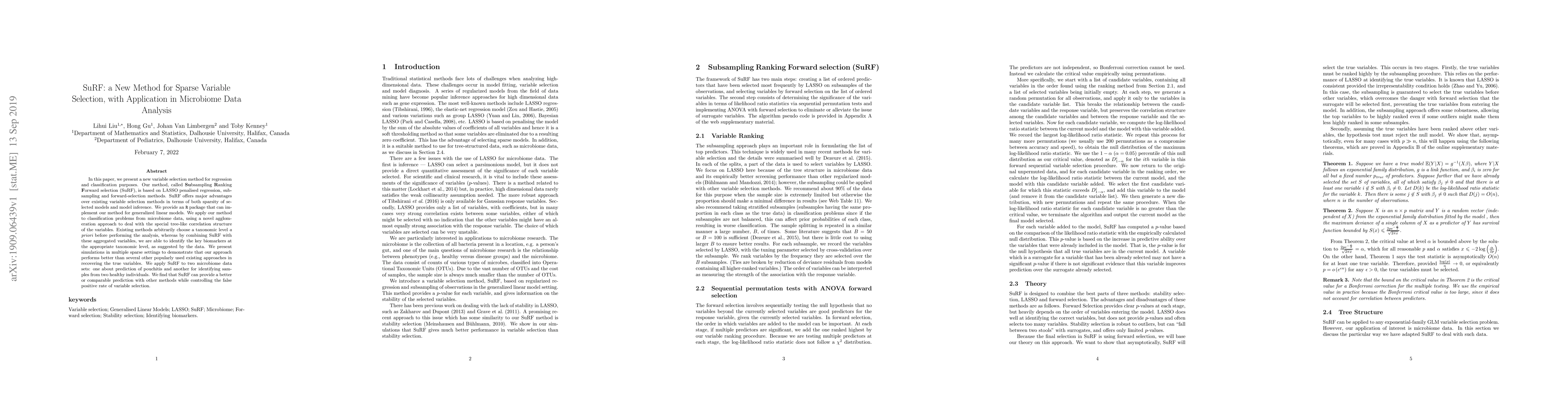 This paper introduces SuRF, a novel variable selection method combining LASSO, subsampling, and forward-selection for regression and classification. It outperforms existing methods in sparsity and model inference, demonstrated through simulations and applications in microbiome data analysis, where it identifies key biomarkers at appropriate taxonomic levels.