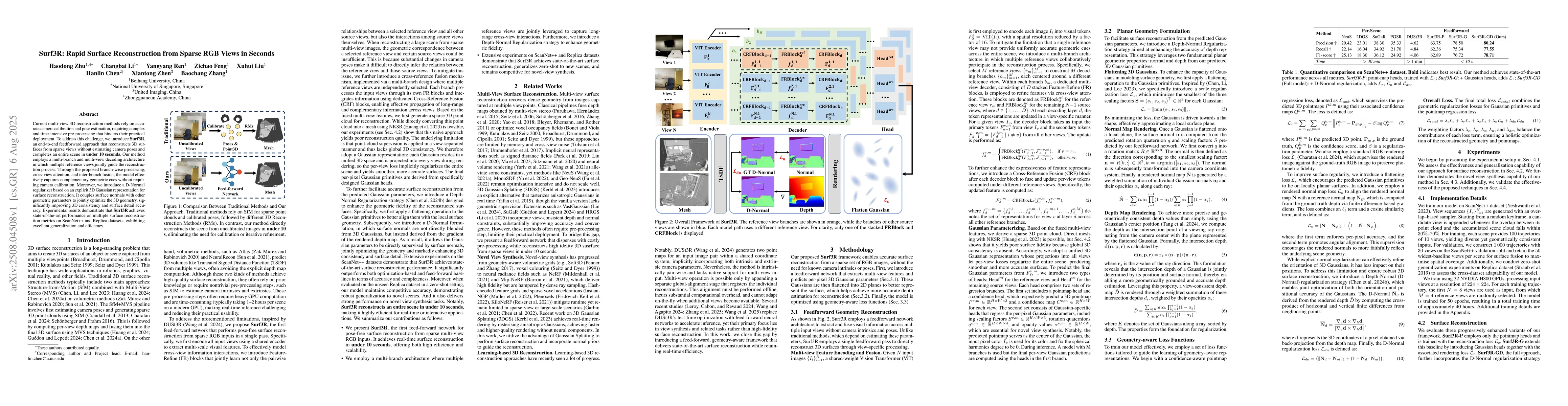 Current multi-view 3D reconstruction methods rely on accurate camera calibration and pose estimation, requiring complex and time-intensive pre-processing that hinders their practical deployment. To address this challenge, we introduce Surf3R, an end-to-end feedforward approach that reconstructs 3D surfaces from sparse views without estimating camera poses and completes an entire scene in under 10 seconds. Our method employs a multi-branch and multi-view decoding architecture in which multiple reference views jointly guide the reconstruction process. Through the proposed branch-wise processing, cross-view attention, and inter-branch fusion, the model effectively captures complementary geometric cues without requiring camera calibration. Moreover, we introduce a D-Normal regularizer based on an explicit 3D Gaussian representation for surface reconstruction. It couples surface normals with other geometric parameters to jointly optimize the 3D geometry, significantly improving 3D consistency and surface detail accuracy. Experimental results demonstrate that Surf3R achieves state-of-the-art performance on multiple surface reconstruction metrics on ScanNet++ and Replica datasets, exhibiting excellent generalization and efficiency.
