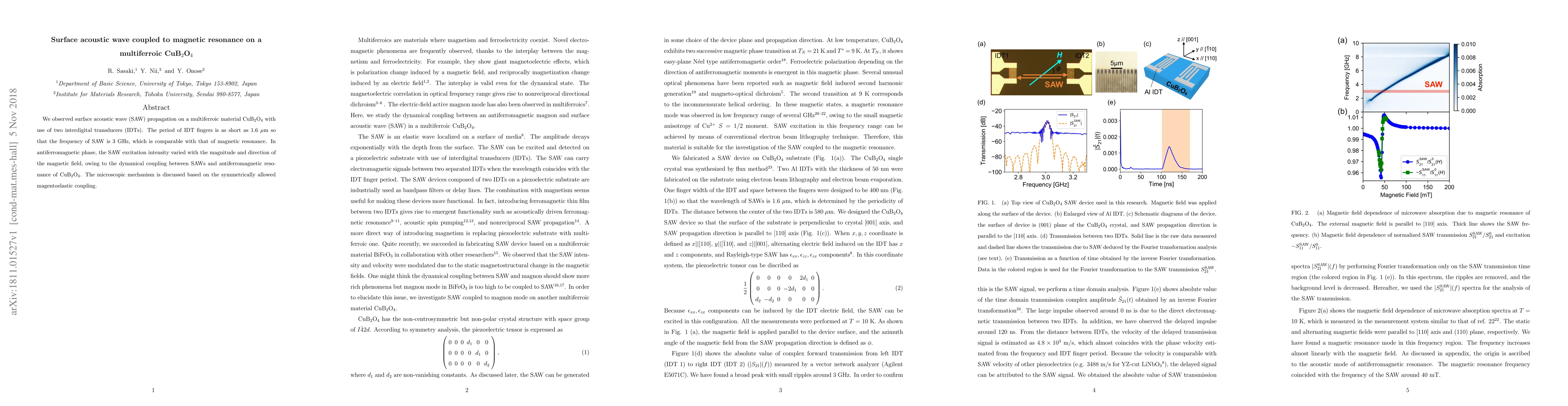 We observed surface acoustic wave (SAW) propagation on a multiferroic material CuB$_2$O$_4$ with use of two interdigital transducers (IDTs). The period of IDT fingers is as short as 1.6 $\mu$m so that the frequency of SAW is 3 GHz, which is comparable with that of magnetic resonance. In antiferromagnetic phase, the SAW excitation intensity varied with the magnitude and direction of the magnetic field, owing to the dynamical coupling between SAWs and antiferromagnetic resonance of CuB$_2$O$_4$. The microscopic mechanism is discussed based on the symmetrically allowed magentoelastic coupling.