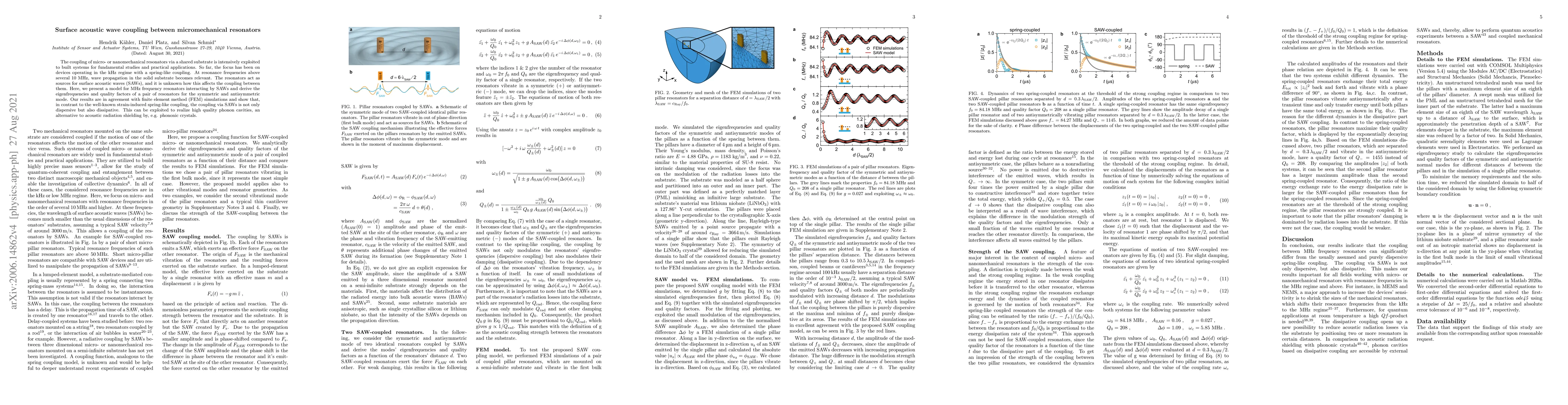 This paper models the coupling of MHz frequency micromechanical resonators via surface acoustic waves (SAWs), revealing that SAW coupling is both dispersive and dissipative, contrasting with traditional spring-like coupling, and suggesting its potential for high-quality phonon cavity applications.