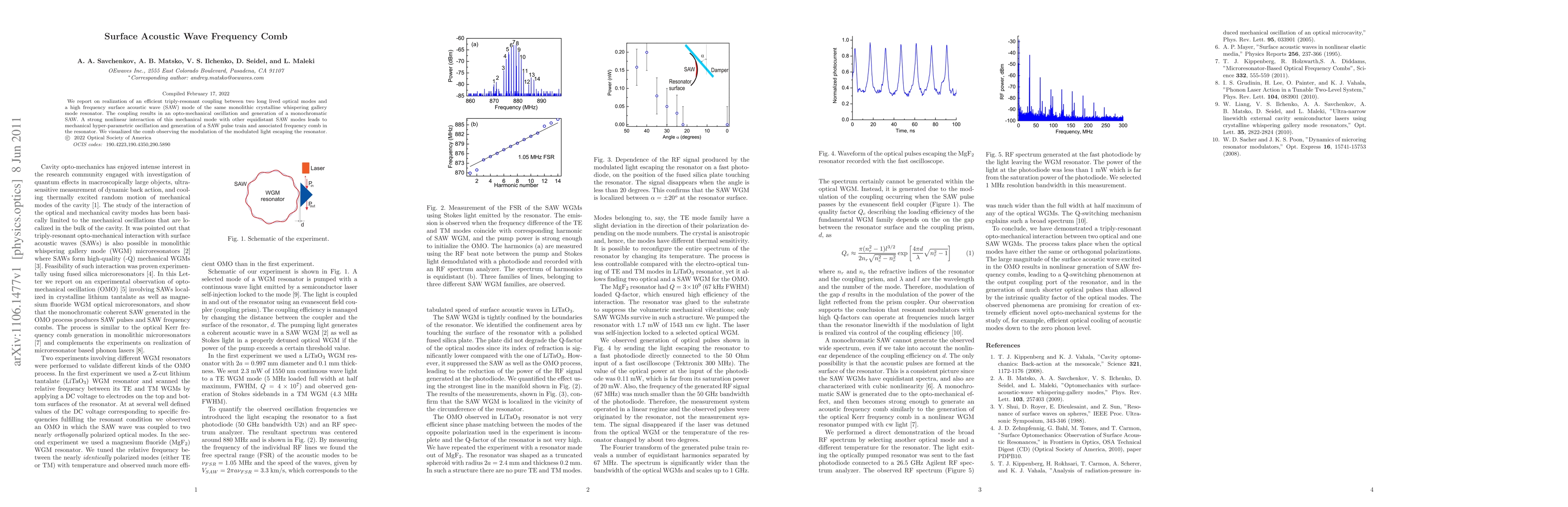 This study demonstrates efficient triply-resonant coupling in a crystalline whispering gallery mode resonator, leading to the generation of a monochromatic surface acoustic wave (SAW) and a mechanical hyper-parametric oscillation that produces a surface acoustic wave frequency comb, visualized through modulated light.