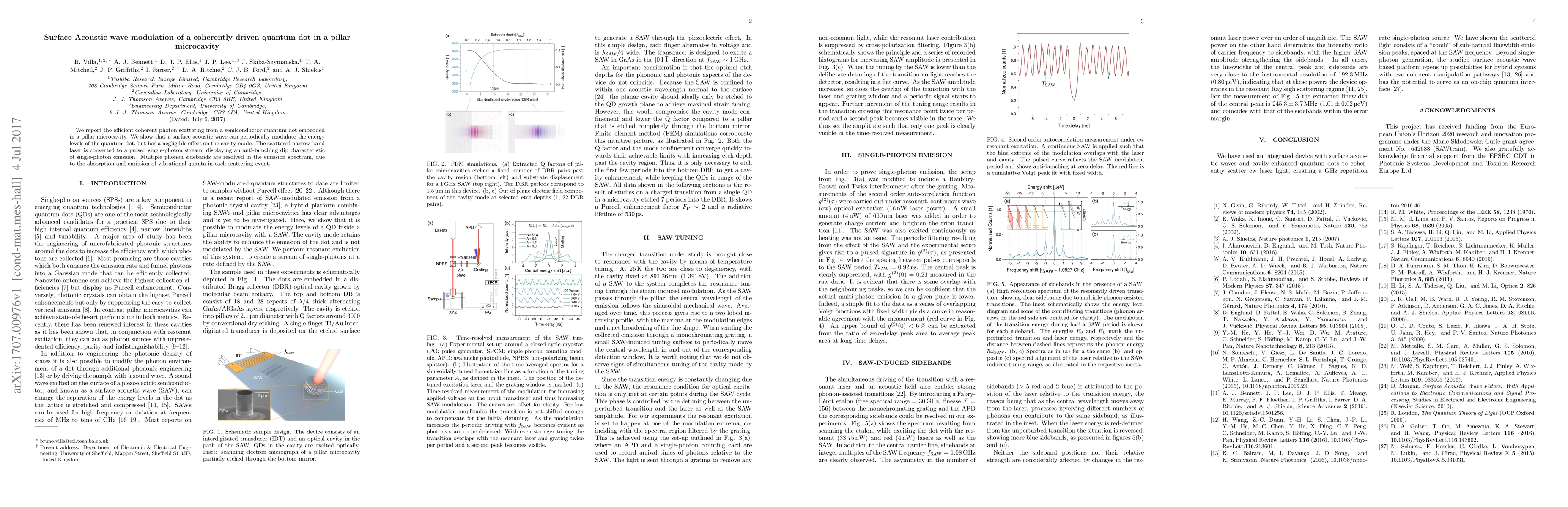 This paper demonstrates efficient coherent photon scattering from a quantum dot in a microcavity, where a surface acoustic wave modulates the quantum dot's energy levels without affecting the cavity mode. The result is a pulsed single-photon stream with phonon sidebands, indicating the absorption and emission of vibrational quanta.