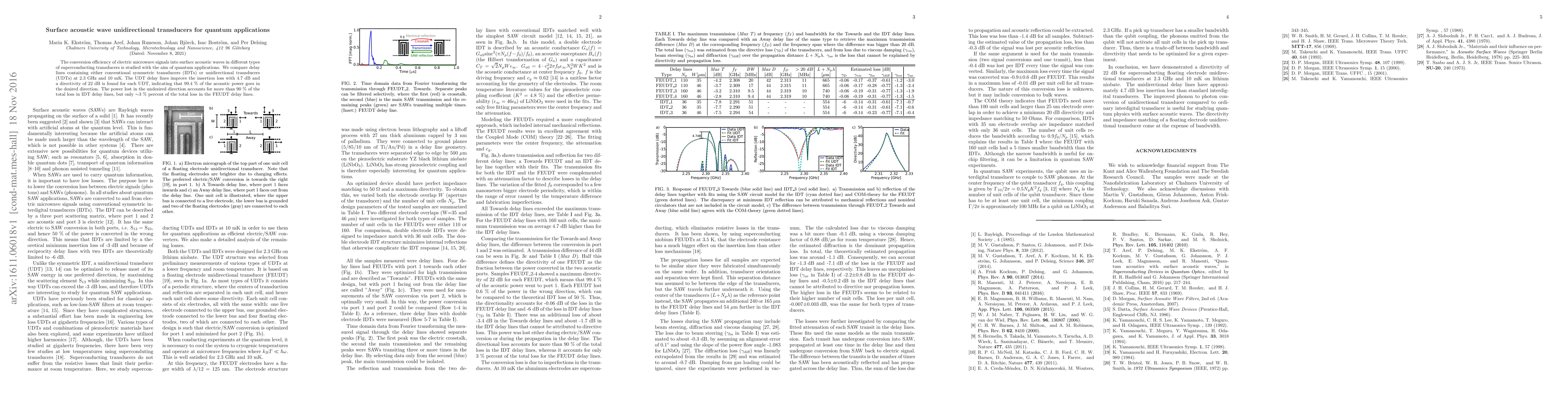 This study investigates the efficiency of electric microwave signal conversion into surface acoustic waves using superconducting transducers for quantum applications. Unidirectional transducers (UDTs) significantly improve insertion loss by 4.7 dB and exhibit a directivity of 22 dB, directing 99.4% of the acoustic power in the desired direction, contrasting with conventional transducers.
