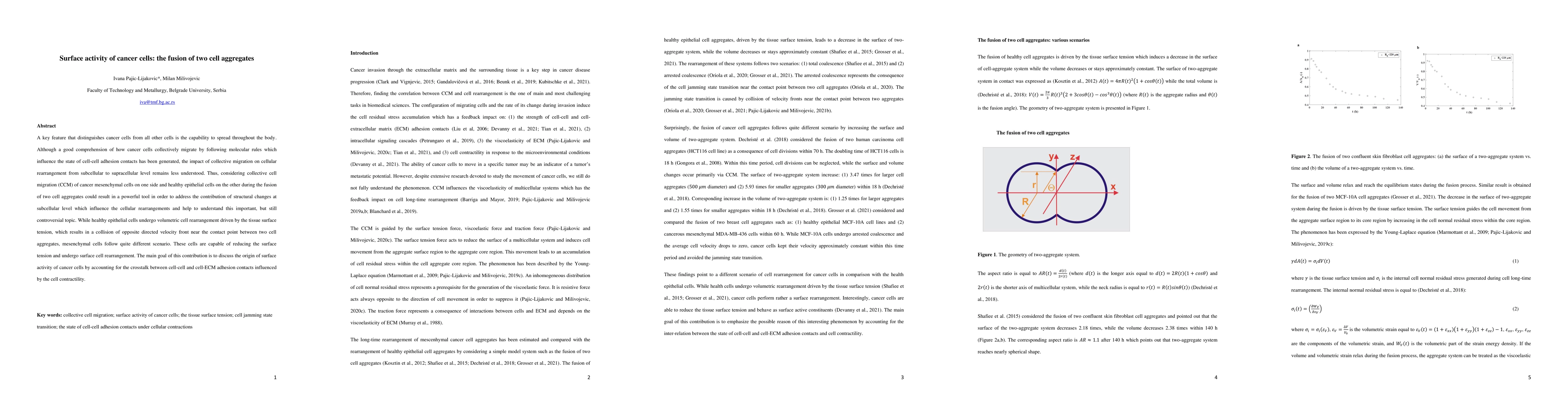 Although a good comprehension of how cancer cells collectively migrate by following molecular rules which influence the state of cell-cell adhesion contacts has been generated, the impact of collective migration on cellular rearrangement from subcellular to supracellular level remains less understood. Thus, considering collective cell migration (CCM) of cancer mesenchymal cells on one side and healthy epithelial cells on the other during the fusion of two cell aggregates could result in a powerful tool in order to address the contribution of structural changes at subcellular level which influence the cellular rearrangements and help to understand this important, but still controversial topic. While healthy epithelial cells undergo volumetric cell rearrangement driven by the tissue surface tension, which results in a collision of opposite directed velocity front near the contact point between two cell aggregates, mesenchymal cells follow quite different scenario. These cells are capable of reducing the surface tension and undergo surface cell rearrangement. The main goal of this contribution is to discuss the origin of surface activity of cancer cells by accounting for the crosstalk between cell-cell and cell-ECM adhesion contacts influenced by the cell contractility.