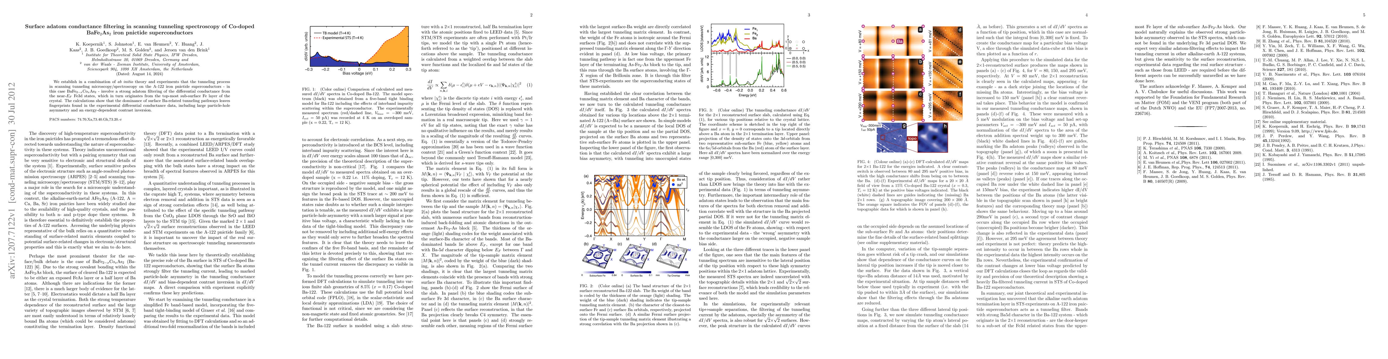 This research combines ab initio theory and experimental data to demonstrate that scanning tunneling microscopy/spectroscopy on Co-doped BaFe$_{2-x}$Co$_x$As$_2$ iron pnictide superconductors reveals strong adatom filtering of differential conductance from near-EF Fe3d states, primarily from the top-most sub-surface Fe layer, with surface Ba-related pathways showing large particle-hole asymmetry and energy-dependent contrast inversion.