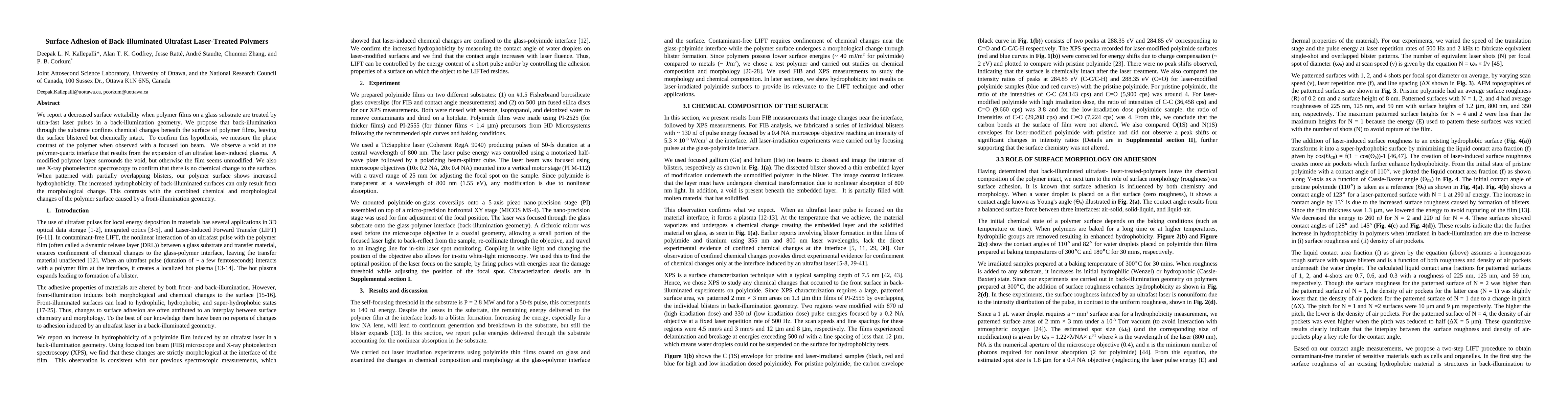 We report a decreased surface wettability when polymer films on a glass substrate are treated by ultra-fast laser pulses in a back-illumination geometry. We propose that back-illumination through the substrate confines chemical changes beneath the surface of polymer films, leaving the surface blistered but chemically intact. To confirm this hypothesis, we measure the phase contrast of the polymer when observed with a focused ion beam. We observe a void at the polymer-quartz interface that results from the expansion of an ultrafast laser-induced plasma. A modified polymer layer surrounds the void, but otherwise the film seems unmodified. We also use X-ray photoelectron spectroscopy to confirm that there is no chemical change to the surface. When patterned with partially overlapping blisters, our polymer surface shows increased hydrophobicity. The increased hydrophobicity of back-illuminated surfaces can only result from the morphological change. This contrasts with the combined chemical and morphological changes of the polymer surface caused by a front-illumination geometry.