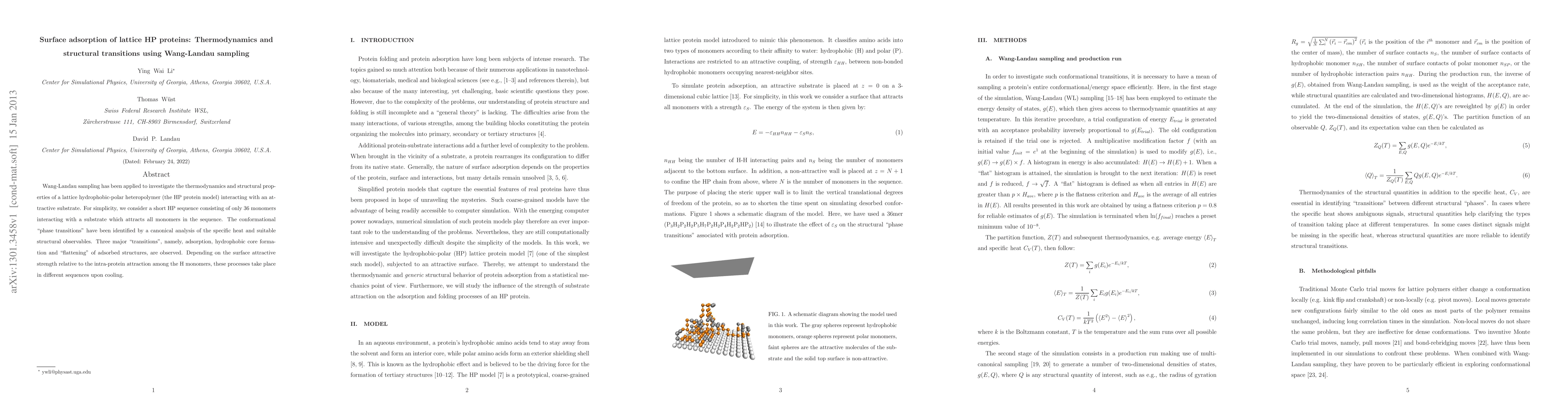 This study uses Wang-Landau sampling to analyze the thermodynamics and structural transitions of a lattice HP protein model interacting with a substrate. Three major transitions—adsorption, hydrophobic core formation, and flattening—are identified, with their sequence dependent on the relative strength of surface attraction versus intra-protein attraction.