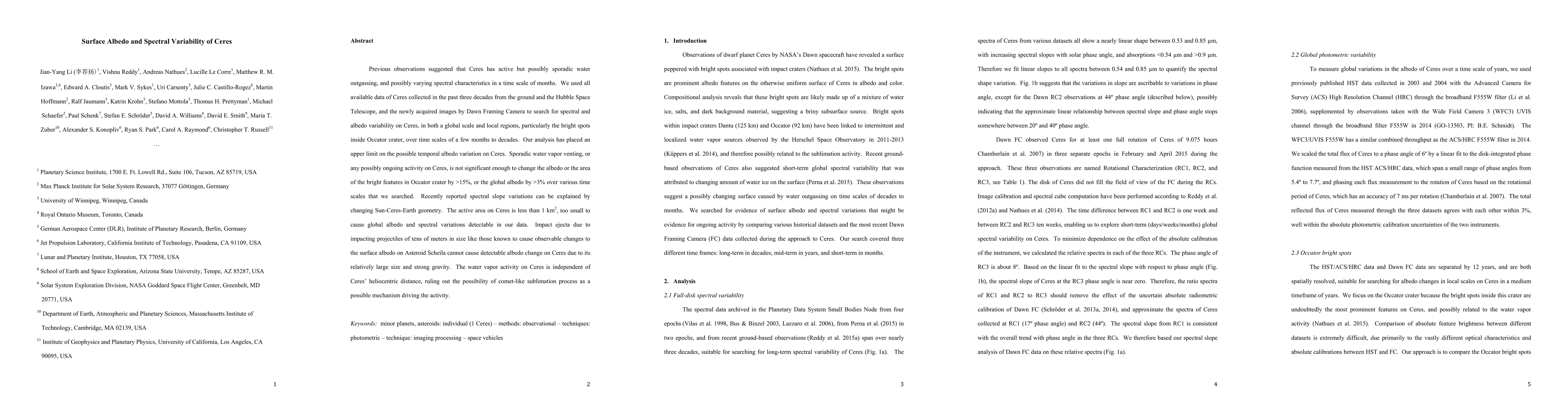 This study analyzed Ceres' surface albedo and spectral variability using decades of observational data and recent Dawn mission images, finding no significant temporal albedo changes or spectral slope variations beyond 15% and 3% respectively, indicating minimal active water outgassing and surface activity on Ceres.