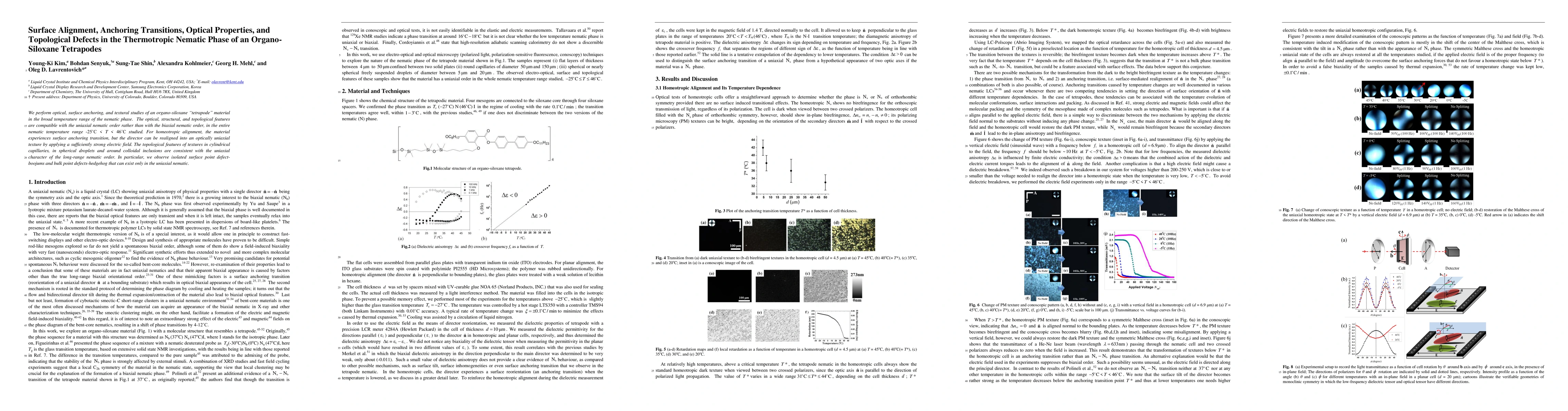 This paper investigates the optical and surface anchoring properties of an organo-siloxane tetrapode material in its nematic phase, confirming its uniaxial nematic order and observing topological defects like boojums and hedgehogs. The material undergoes a surface anchoring transition for homeotropic alignment but can be realigned with a strong electric field.