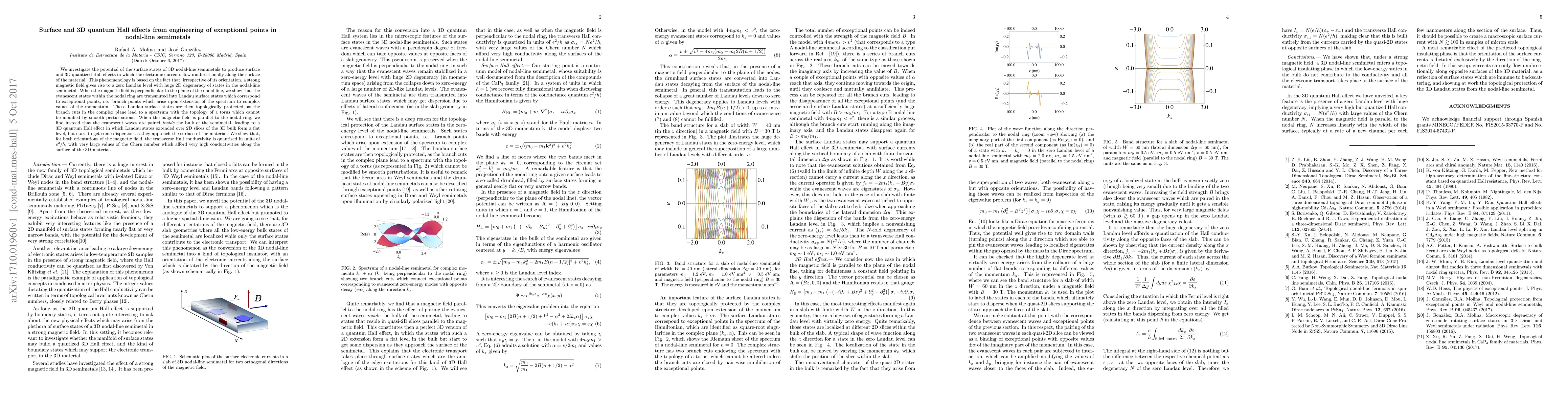 We investigate the potential of the surface states of 3D nodal-line semimetals to produce surface and 3D quantized Hall effects in which the electronic currents flow unidirectionally along the surface of the material. This phenomenology is based on the fact that, irrespective of its orientation, a strong magnetic field gives rise to a zero Landau level with huge 2D degeneracy of states in the nodal-line semimetal. When the magnetic field is perpendicular to the plane of the nodal line, we show that the evanescent states within the nodal ring are transmuted into Landau surface states which correspond to exceptional points, i.e. branch points which arise upon extension of the spectrum to complex values of the momentum. These Landau surface states are then topologically protected, as the branch cuts in the complex plane lead to a spectrum with the topology of a torus which cannot be modified by smooth perturbations. When the magnetic field is parallel to the nodal ring, we find instead that the evanescent waves are paired inside the bulk of the semimetal, leading to a 3D quantum Hall effect in which Landau states extended over 2D slices of the 3D bulk form a flat level, but start to get some dispersion as they approach the surface of the material. We show that, for both orientations of the magnetic field, the transverse Hall conductivity is quantized in units of $e^2/h$, with very large values of the Chern number which afford very high conductivities along the surface of the 3D material.