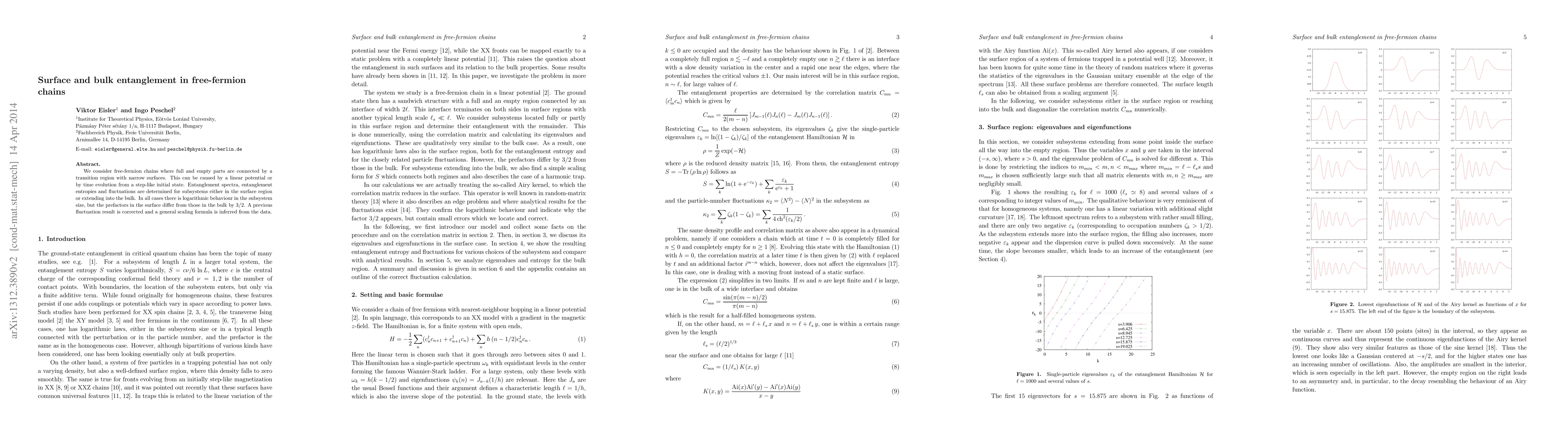 This paper investigates entanglement in free-fermion chains with a transition region, finding logarithmic growth in entanglement spectra and entropy with differing prefactors for surface and bulk regions. A corrected fluctuation result and a general scaling formula are derived from the data.