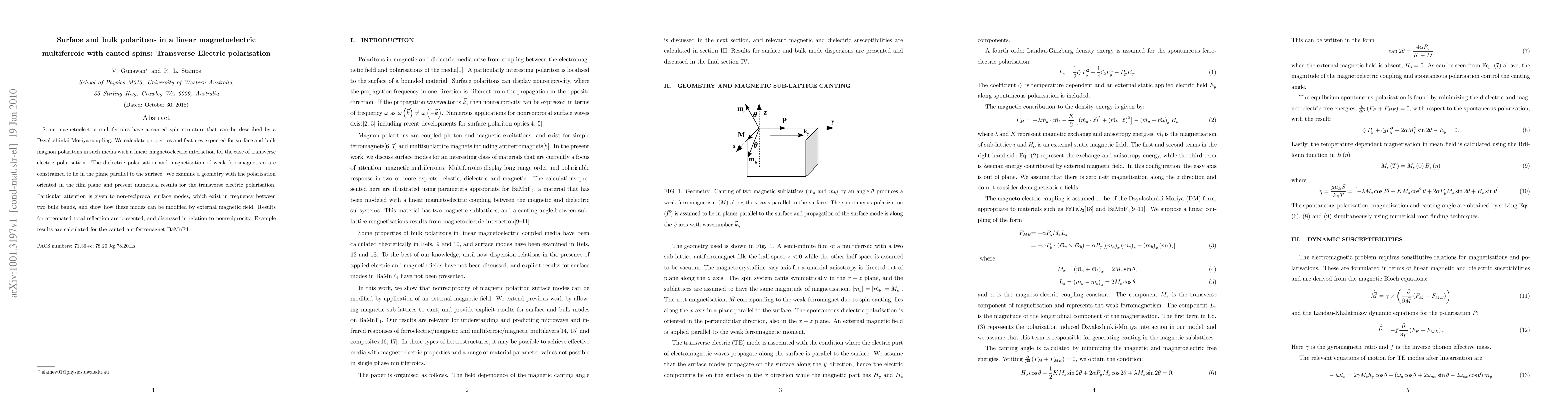 Researchers studied surface and bulk polaritons in a magnetoelectric material with canted spins, finding non-reciprocal surface modes that can be modified by external magnetic fields.