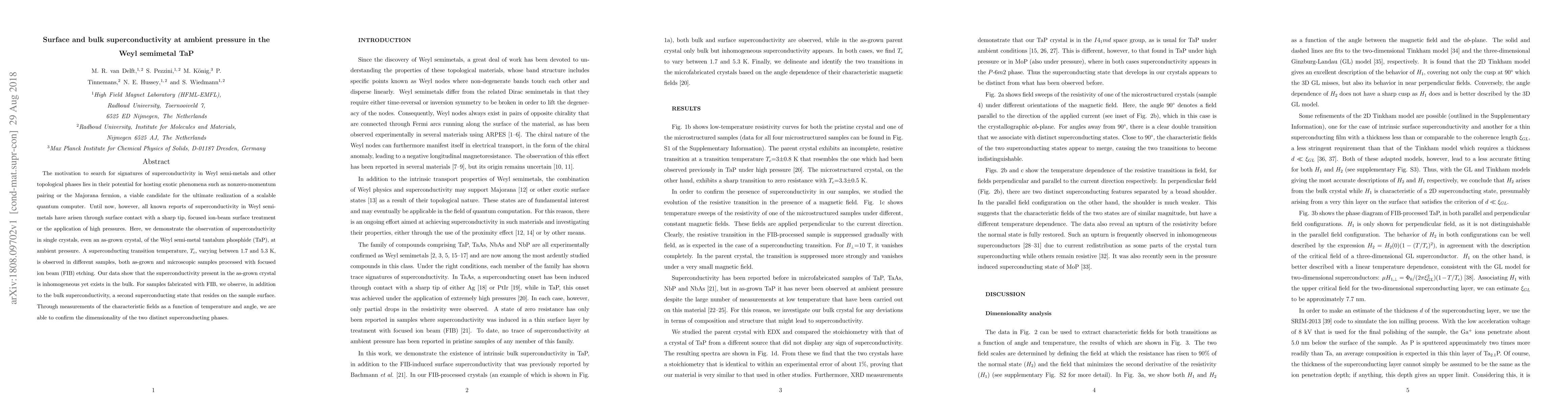 This paper reports the discovery of superconductivity in the Weyl semimetal TaP at ambient pressure, with both bulk and surface superconductivity observed in as-grown crystals. The study reveals a superconducting transition temperature ranging from 1.7 to 5.3 K, and identifies two distinct superconducting phases, one in the bulk and a second on the surface.