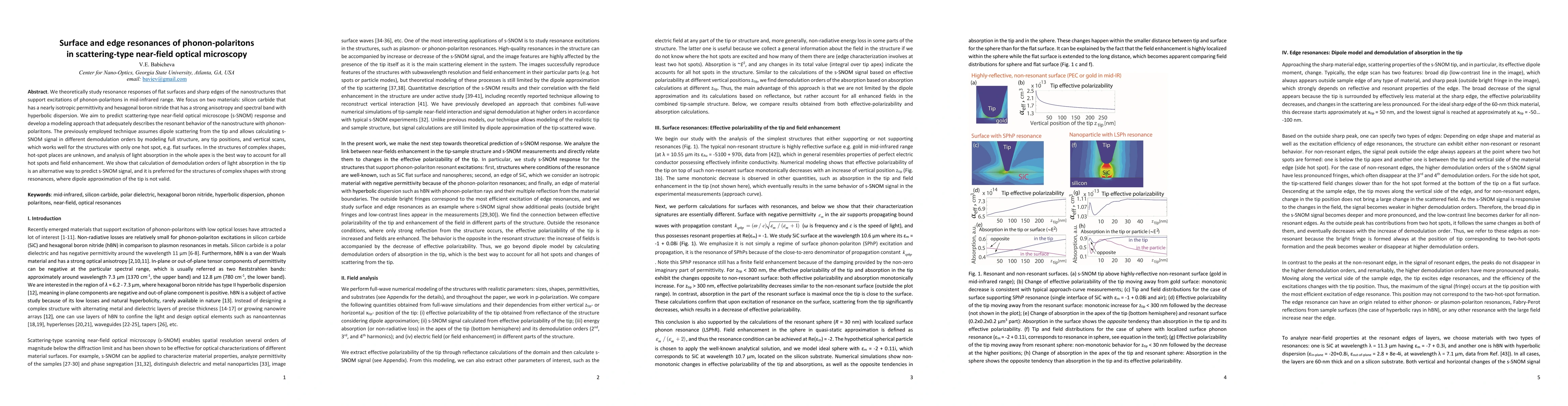 We theoretically study resonance responses of flat surfaces and sharp edges of the nanostructures that support excitations of phonon-polaritons in mid-infrared range. We focus on two materials: silicon carbide that has a nearly isotropic permittivity and hexagonal boron nitride that has a strong anisotropy and spectral band with hyperbolic dispersion. We aim to predict scattering-type near-field optical microscope (s-SNOM) response and develop a modeling approach that adequately describes the resonant behavior of the nanostructure with phonon-polaritons. The previously employed technique assumes dipole scattering from the tip and allows calculating s-SNOM signal in different demodulation orders by modeling full structure, any tip positions, and vertical scans, which works well for the structures with only one hot spot, e.g. flat surfaces. In the structures of complex shapes, hot-spot places are unknown, and analysis of light absorption in the whole apex is the best way to account for all hot spots and field enhancement. We show that calculation of demodulation orders of light absorption in the tip is an alternative way to predict s-SNOM signal, and it is preferred for the structures of complex shapes with strong resonances, where dipole approximation of the tip is not valid.
