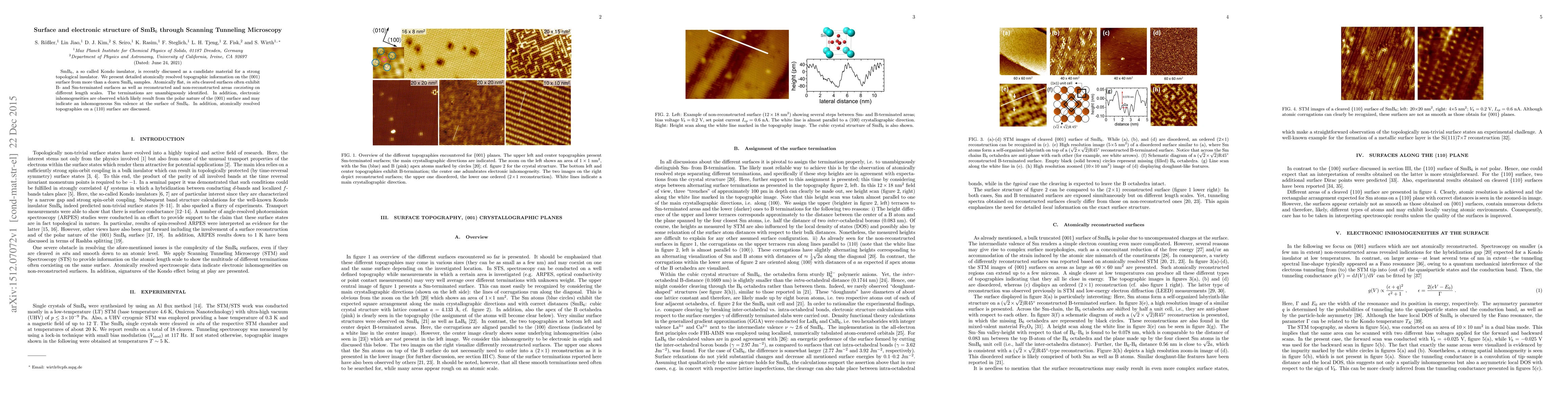 This study uses Scanning Tunneling Microscopy to analyze the surface and electronic structure of SmB$_6$, revealing atomically flat, in situ cleaved (001) surfaces with coexisting B- and Sm-terminated areas, along with electronic inhomogeneities likely due to the polar nature of the surface, suggesting inhomogeneous Sm valence. Atomically resolved topographies on (110) surfaces are also examined.