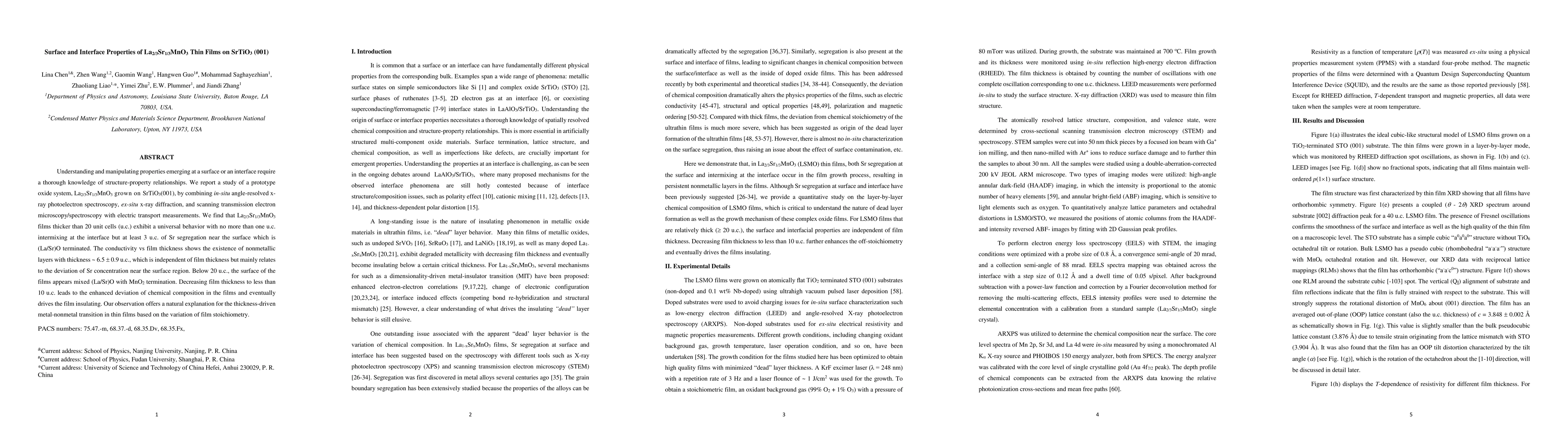 The paper presents a detailed characterization of La2/3Sr1/3MnO3 thin films on SrTiO3(001) using a combination of advanced spectroscopy and microscopy techniques, revealing the thickness-dependent behavior of surface and interface properties.