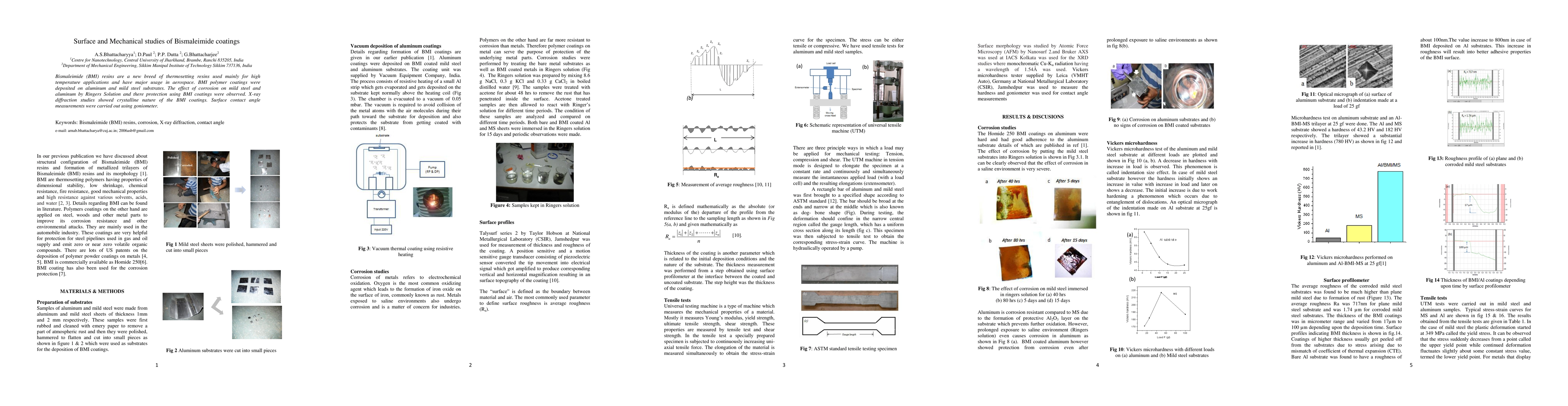 Researchers studied Bismaleimide coatings on aluminum and steel substrates for corrosion protection, finding that BMI coatings show a crystalline nature and provide protection against corrosion using Ringers Solution.