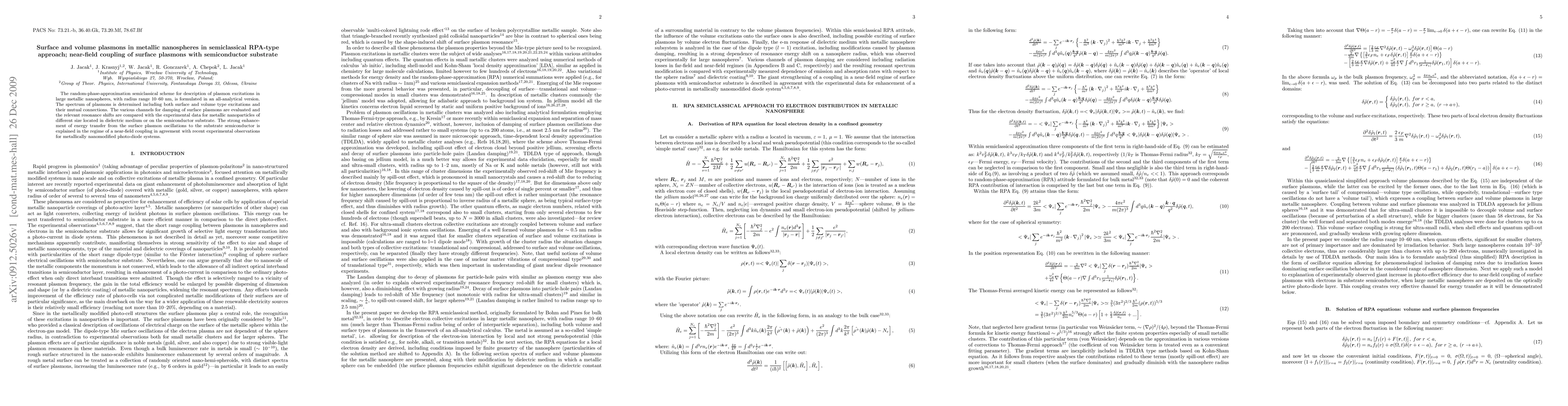 This paper presents an analytical semiclassical random-phase-approximation model for describing plasmon excitations in metallic nanospheres, detailing both surface and volume plasmons. It evaluates damping channels and resonance shifts, comparing them to experimental data, and explains the enhanced energy transfer from surface plasmons to semiconductor substrates via near-field coupling.