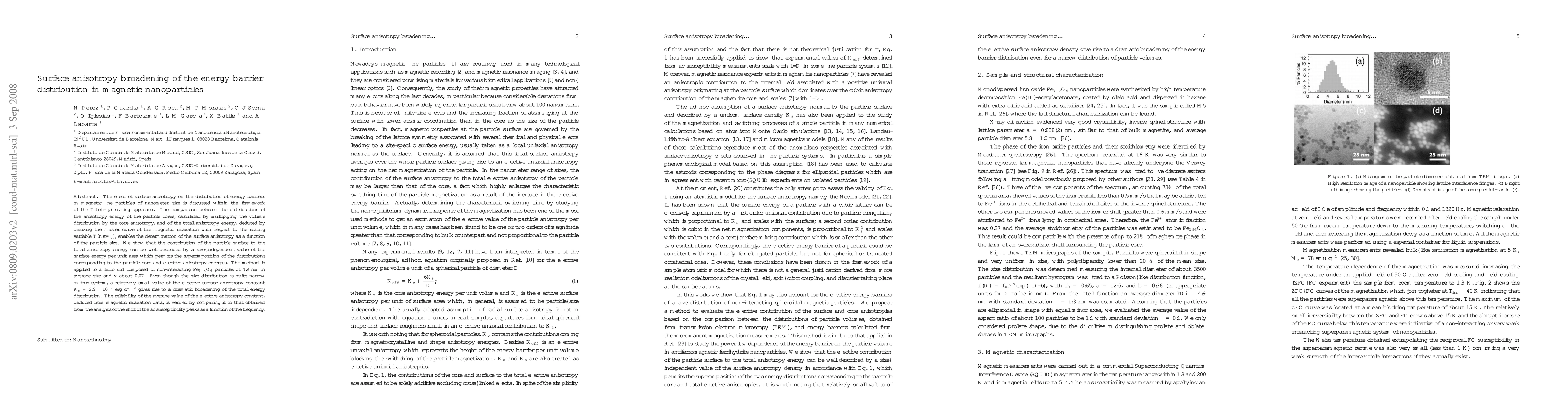 This paper investigates the impact of surface anisotropy on the energy barrier distribution in nanometer-sized magnetic particles using a $T\ln(t/\tau_0)$ scaling approach. The study reveals that surface anisotropy broadens the energy barrier distribution significantly, despite a narrow particle size distribution, due to a relatively small surface anisotropy constant.