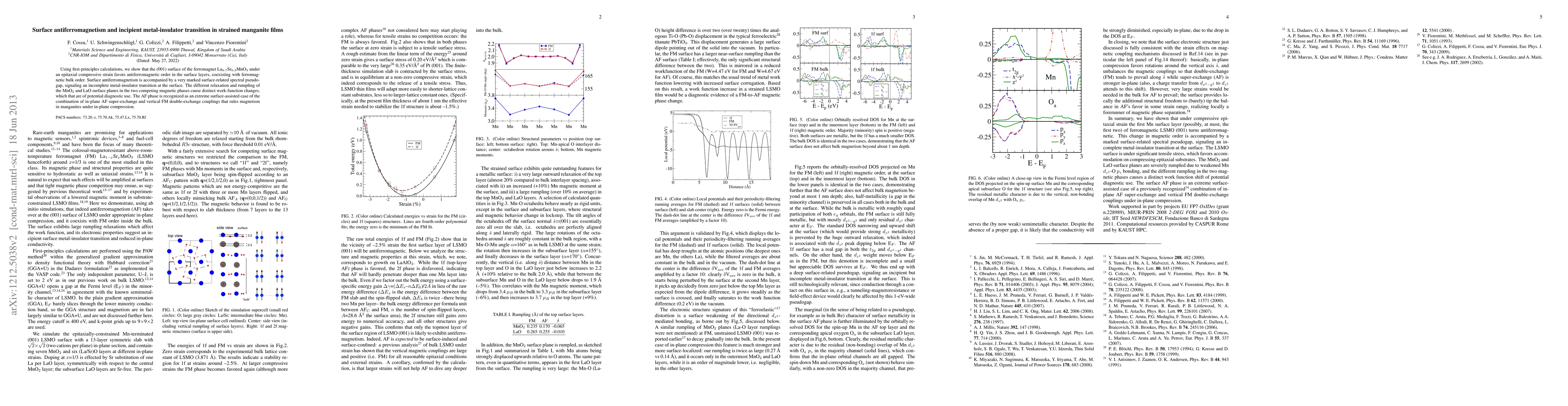 This paper demonstrates that strained (001) surface of La$_{1-x}$Sr$_{x}$MnO$_{3}$ exhibits antiferromagnetic ordering due to epitaxial compression, accompanied by a metal-insulator transition near the surface, as indicated by a spectral pseudogap. The surface relaxation and rumpling cause significant changes in work function.