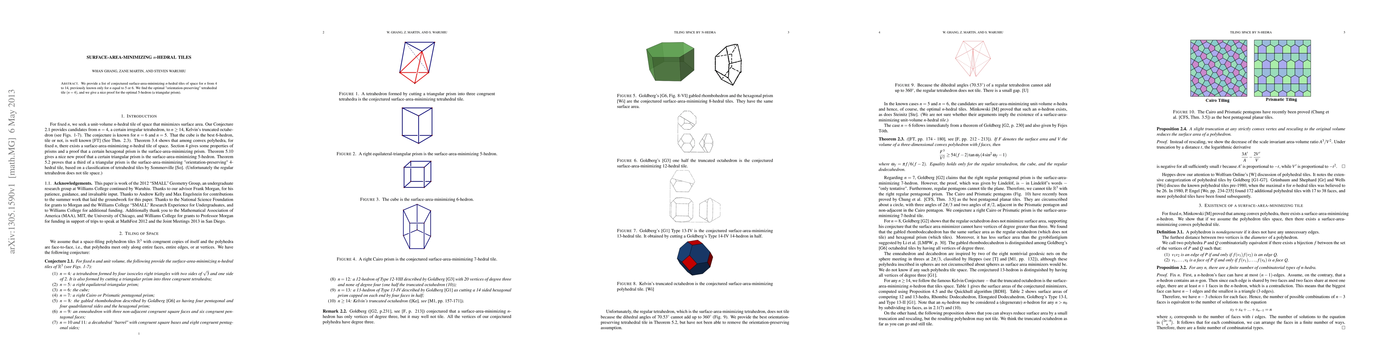 We provide a list of conjectured surface-area-minimizing n-hedral tiles of space for n from 4 to 14, previously known only for n equal to 5 or 6. We find the optimal "orientation-preserving" tetrahedral tile (n=4), and we give a nice proof for the optimal 5-hedron (a triangular prism).