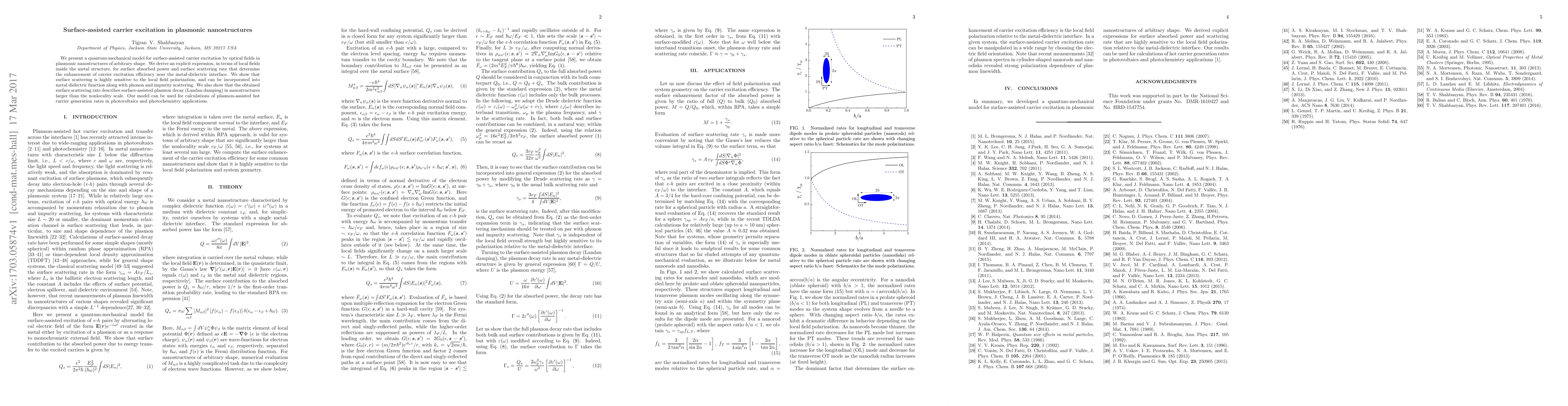 This paper develops a quantum-mechanical model for carrier excitation in plasmonic nanostructures, detailing the surface absorbed power and surface scattering rate influenced by local field polarization. The model also describes plasmon decay and can be applied to calculate hot carrier generation rates for photovoltaic and photochemical applications.