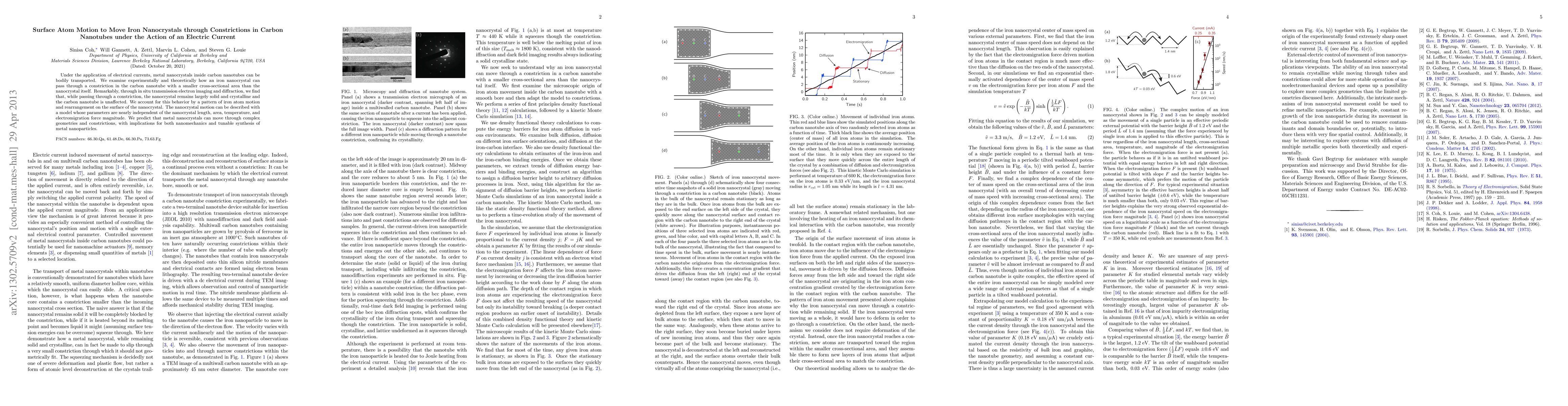 This study investigates how iron nanocrystals navigate constrictions within carbon nanotubes under electric current, revealing that surface atom motion enables the nanocrystal to pass through without deforming. The findings suggest a model for nanocrystal movement that is largely independent of various physical parameters, highlighting potential applications in nanomechanics and nanoparticle synthesis.