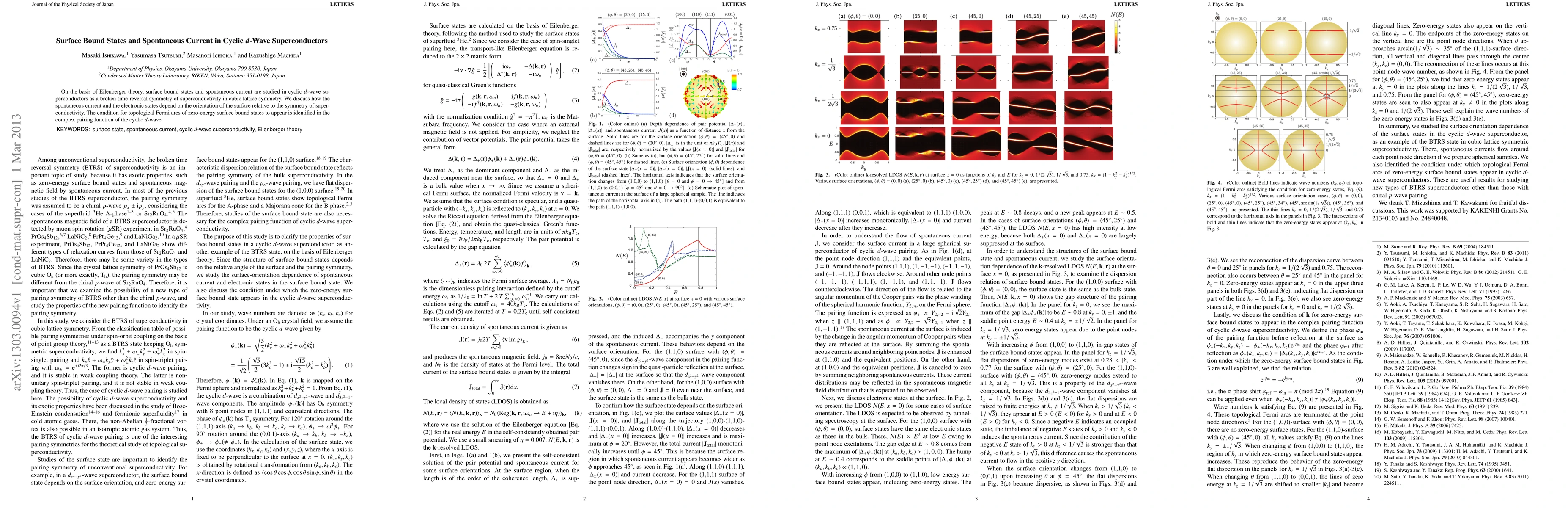 On the basis of Eilenberger theory, surface bound states and spontaneous current are studied in cyclic d-wave superconductors as a broken time-reversal symmetry of superconductivity in cubic lattice symmetry. We discuss how the spontaneous current and the electronic states depend on the orientation of the surface relative to the symmetry of superconductivity. The condition for topological Fermi arcs of zero-energy surface bound states to appear is identified in the complex pairing function of the cyclic d-wave.
