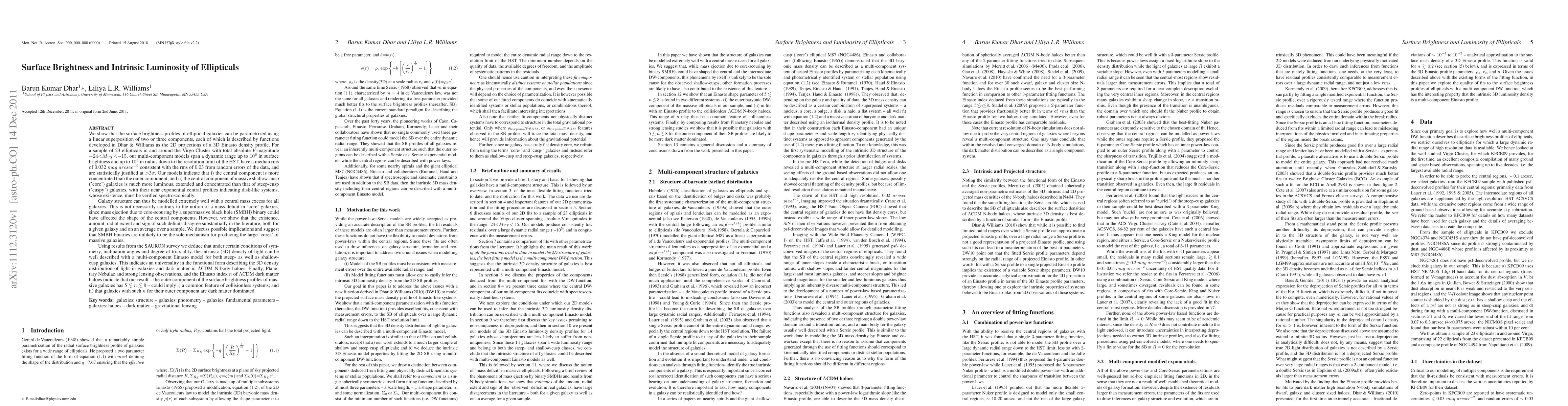 {Abridged} We show that the surface brightness (SB) profiles of elliptical galaxies can be parametrized using a linear superposition of 2-3 components, described by functions developed in Dhar & Williams as the 2D projections of a 3D Einasto profile. For a sample of 23 ellipticals with -24 < Mv < -15, our multi-component models span a range of up to 10^6 in SB and 10^5 in radius, have a median rms of 0.032 mag arcsec^-2, and are statistically justified at >3{\sigma}. Our models indicate that i) the central component is more concentrated than the outer component; and ii) the central component of 'core' galaxies is much more luminous, extended and concentrated than that of 'cuspy' galaxies, with their near exponential central profiles indicating disk-like systems whose existence must be verified spectroscopically. While such central excess components are not necessarily contrary to the notion of a mass deficit in 'core' galaxies, we show that the existence, amount, radial extent and sign of mass deficits disagree substantially in the literature, both for a given galaxy and on an average over a sample. We discuss possible implications and suggest that SMBH binaries are unlikely to be the sole mechanism for producing the large 'cores'. We also deduce conditions under which the 3D light density can be described with a multi-component Einasto model for both cuspy and core galaxies; indicating an universality in the functional form of the 3D density of light in galaxies and dark matter in LCDM N-body haloes. Finally, we show that our result - the outer component of the SB profiles of massive galaxies has 5 < n < 8 - could imply i) a common feature of collisionless systems; and ii) that galaxies with such n for their outer component are dark matter dominated.