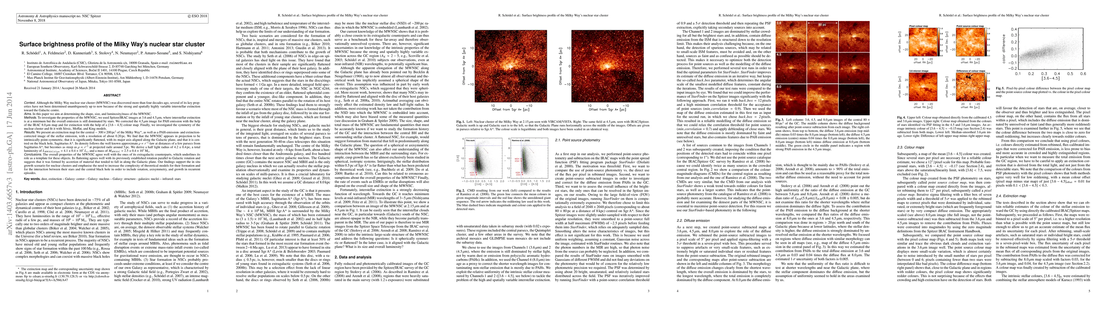 (abridged) In this paper we aim at determining the shape, size, and luminosity/mass of the Milky Way Nuclear Star Cluster (MWNSC). We use Spitzer/IRAC images at 3.6 and 4.5 micrometer, where interstellar extinction is at a minimum but the overall emission is still dominated by stars. We correct the 4.5 micrometer image for PAH emission with the help of the IRAC 8.0 micrometer map and for extinction with the help of a [3.6-4.5] colour map. We present an extinction map for the central ~300x200 pc^2 of the Milky Way, as well as a PAH-emission and extinction corrected image of the stellar emission, with a resolution of about 0.2 pc. We find that the MWNSC appears in projection intrinsically point-symmetric, that it is significantly flattened, with its major axis aligned along the Galactic Plane, and that it is centred on the black hole, Sagittarius A*. Its density follows the well known approximate rho~r^{-2}-law at distances of a few parsecs from Sagittarius A*, but may become as steep as rho~r^{-3} at projected radii around 5 pc. We derive a half light radius of 4.2+-0.4 pc, a total luminosity of L_MWNSC=(4.1+-0.4)x10^{7} L_Sun, and a mass of M_{MWNSC}=(2.5+-0.4)x10^{7} M_Sun. The overall properties of the MWNSC agree well with the ones of its extragalactic counterparts, which underlines its role as a template for these objects. Its flattening agrees well with its previously established rotation parallel to Galactic rotation and suggests that it has formed by accretion of material that fell in preferentially along the Galactic Plane. Our findings support the in situ growth scenario for nuclear clusters and emphasize the need to increase the complexity of theoretical models for their formation and for the interaction between their stars and the central black hole in order to include rotation, axisymmetry, and growth in recurrent episodes.