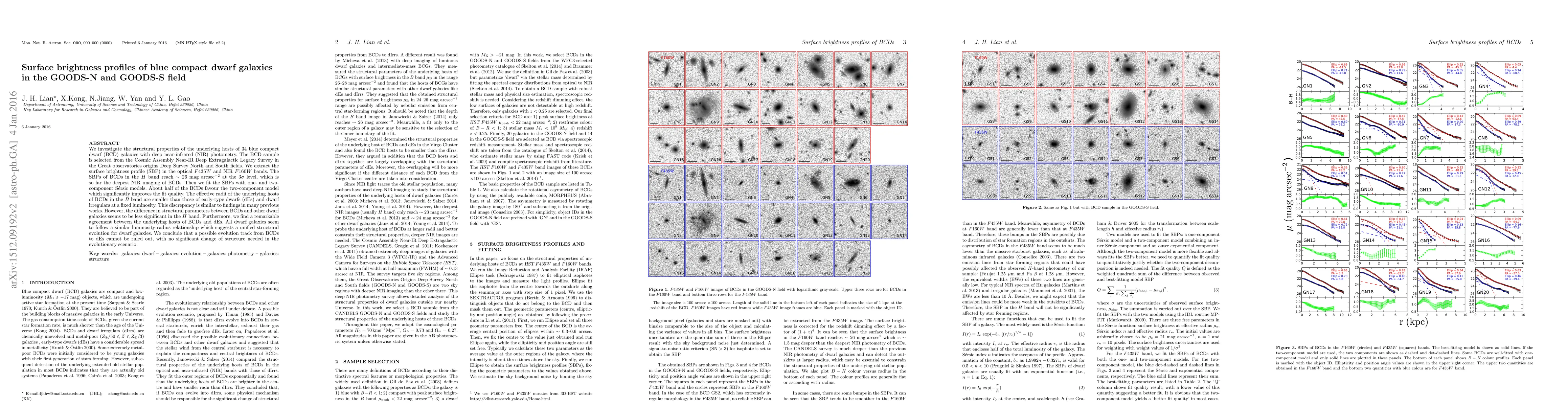 We investigate the structural properties of the underlying hosts of 34 blue compact dwarf (BCD) galaxies with deep near-infrared (NIR) photometry. The BCD sample is selected from the Cosmic Assembly Near-IR Deep Extragalactic Legacy Survey in the Great observatories origins Deep Survey North and South fields. We extract the surface brightness profile (SBP) in the optical F 435W and NIR F 160W bands. The SBPs of BCDs in the H band reach 26 mag arcsec^-2 at the 3\sigma level, which is so far the deepest NIR imaging of BCDs. Then we fit the SBPs with one- and two- component Sersic models. About half of the BCDs favour the two-component model which significantly improves the fit quality. The effective radii of the underlying hosts of BCDs in the B band are smaller than those of early-type dwarfs (dEs) and dwarf irregulars at a fixed luminosity. This discrepancy is similar to findings in many previous works. However, the difference in structural parameters between BCDs and other dwarf galaxies seems to be less significant in the H band. Furthermore, we find a remarkable agreement between the underlying hosts of BCDs and dEs. All dwarf galaxies seem to follow a similar luminosity-radius relationship which suggests a unified structural evolution for dwarf galaxies. We conclude that a possible evolution track from BCDs to dEs cannot be ruled out, with no significant change of structure needed in the evolutionary scenario.