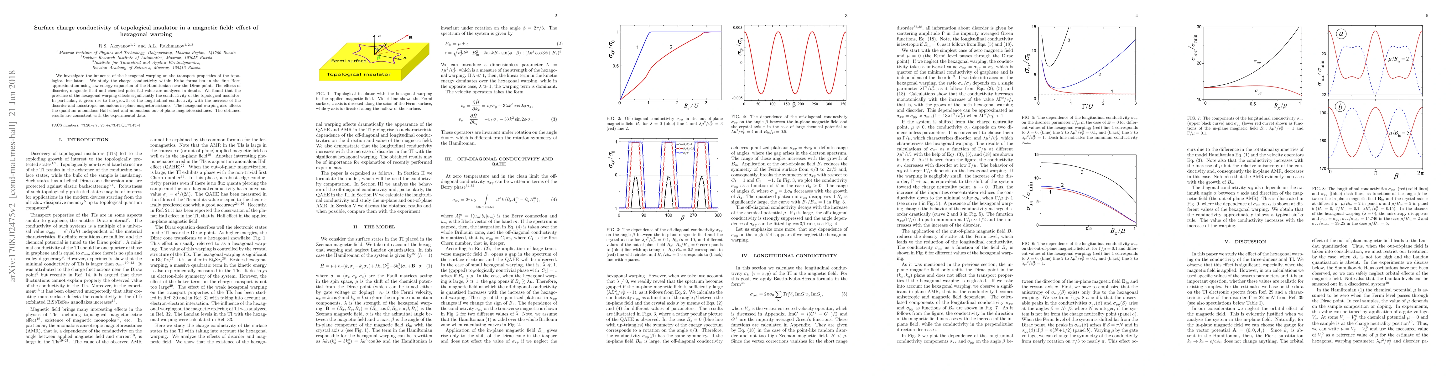 This paper examines how hexagonal warping influences the surface charge conductivity of topological insulators under a magnetic field, revealing significant effects on longitudinal conductivity, magnetoresistance, and the quantum anomalous Hall effect, consistent with experimental observations.