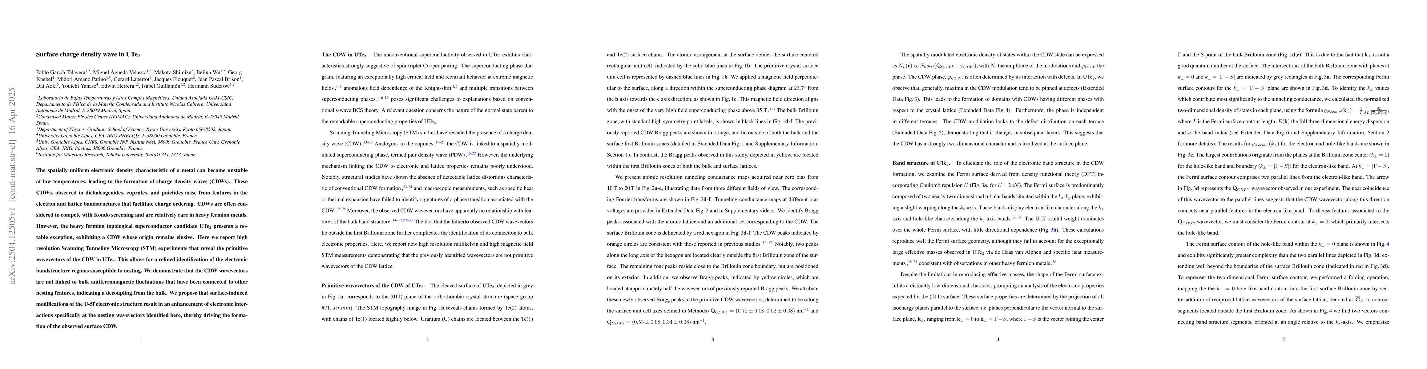 This work distinguishes itself by identifying the surface-induced origin of CDW in UTe2, contrasting with previous assumptions of bulk-driven CDW in heavy fermion metals.