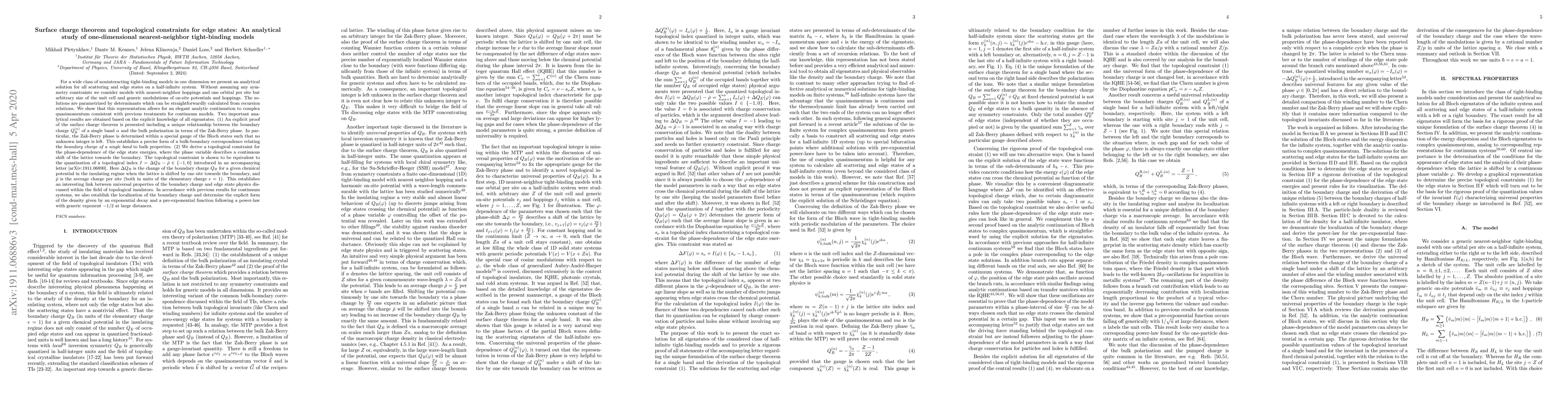 This paper presents an analytical solution for scattering and edge states in one-dimensional tight-binding models, proving the surface charge theorem and establishing a topological constraint for edge state energies. The results link the boundary charge of a single band to bulk polarization and introduce a topological index for edge state quantization.
