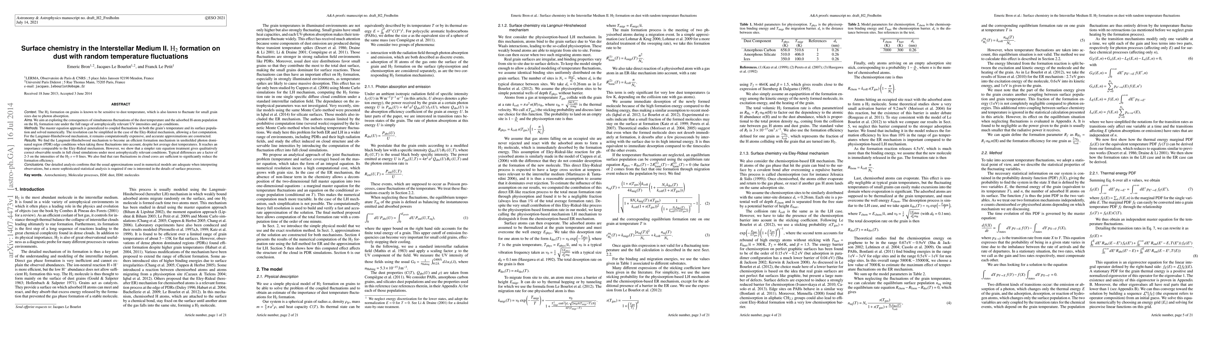 The $\mathrm{H}_2$ formation on grains is known to be sensitive to dust temperature, which is also known to fluctuate for small grain sizes due to photon absorption. We aim at exploring the consequences of simultaneous fluctuations of the dust temperature and the adsorbed H-atom population on the $\mathrm{H}_2$ formation rate under the full range of astrophysically relevant UV intensities and gas conditions. The master equation approach is generalized to coupled fluctuations in both the grain's temperature and its surface population and solved numerically. The resolution can be simplified in the case of the Eley-Rideal mechanism, allowing a fast computation. For the Langmuir-Hinshelwood mechanism, it remains computationally expensive, and accurate approximations are constructed. We find the Langmuir-Hinshelwood mechanism to become an efficient formation mechanism in unshielded photon dominated region (PDR) edge conditions when taking those fluctuations into account, despite hot average dust temperatures. It reaches an importance comparable to the Eley-Rideal mechanism. However, we show that a simpler rate equation treatment gives qualitatively correct observable results in full cloud simulations under most astrophysically relevant conditions. Typical differences are a factor of 2-3 on the intensities of the $\mathrm{H}_2$ $v=0$ lines. We also find that rare fluctuations in cloud cores are sufficient to significantly reduce the formation efficiency. Our detailed analysis confirms that the usual approximations used in numerical models are adequate when interpreting observations, but a more sophisticated statistical analysis is required if one is interested in the details of surface processes.
