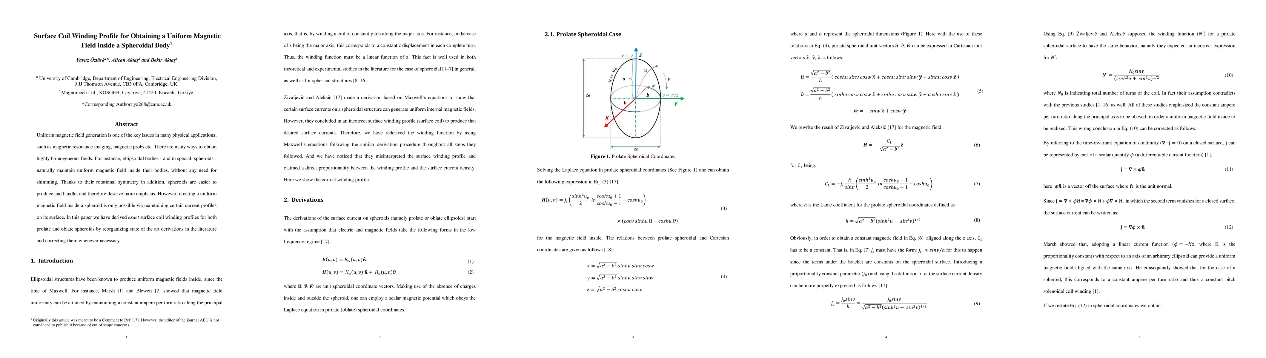 The paper presents rigorous derivations of surface coil winding profiles for prolate and oblate spheroids, correcting previous misconceptions and providing a solid theoretical foundation for generating uniform magnetic fields within spheroidal bodies.