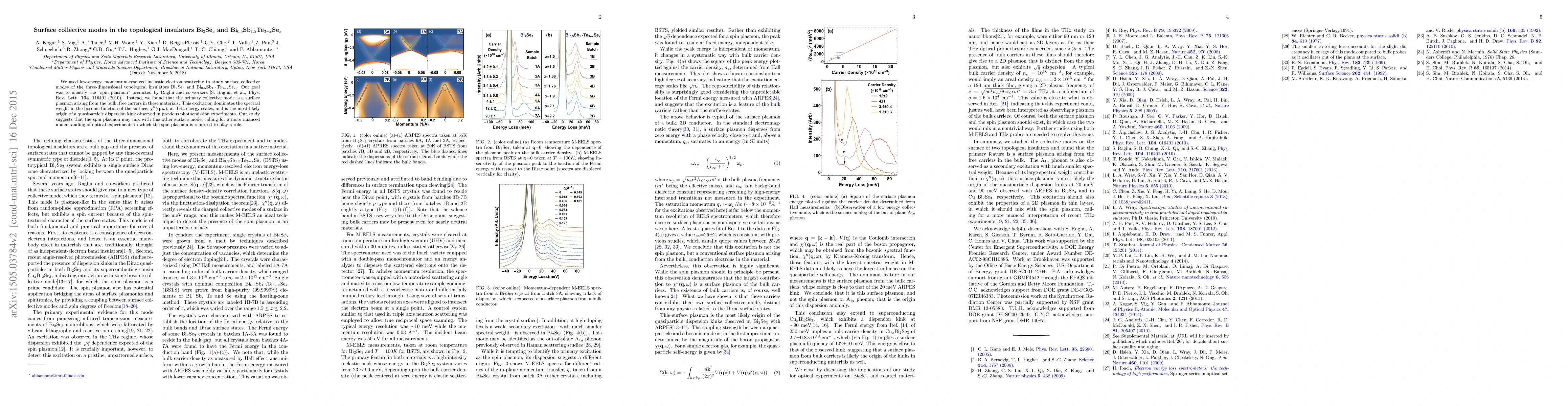 We used low-energy, momentum-resolved inelastic electron scattering to study surface collective modes of the three-dimensional topological insulators Bi$_2$Se$_3$ and Bi$_{0.5}$Sb$_{1.5}$Te$_{3-x}$Se$_{x}$. Our goal was to identify the "spin plasmon" predicted by Raghu and co-workers [S. Raghu, et al., Phys. Rev. Lett. 104, 116401 (2010)]. Instead, we found that the primary collective mode is a surface plasmon arising from the bulk, free carrers in these materials. This excitation dominates the spectral weight in the bosonic function of the surface, $\chi "(\textbf{q},\omega)$, at THz energy scales, and is the most likely origin of a quasiparticle dispersion kink observed in previous photoemission experiments. Our study suggests that the spin plasmon may mix with this other surface mode, calling for a more nuanced understanding of optical experiments in which the spin plasmon is reported to play a role.