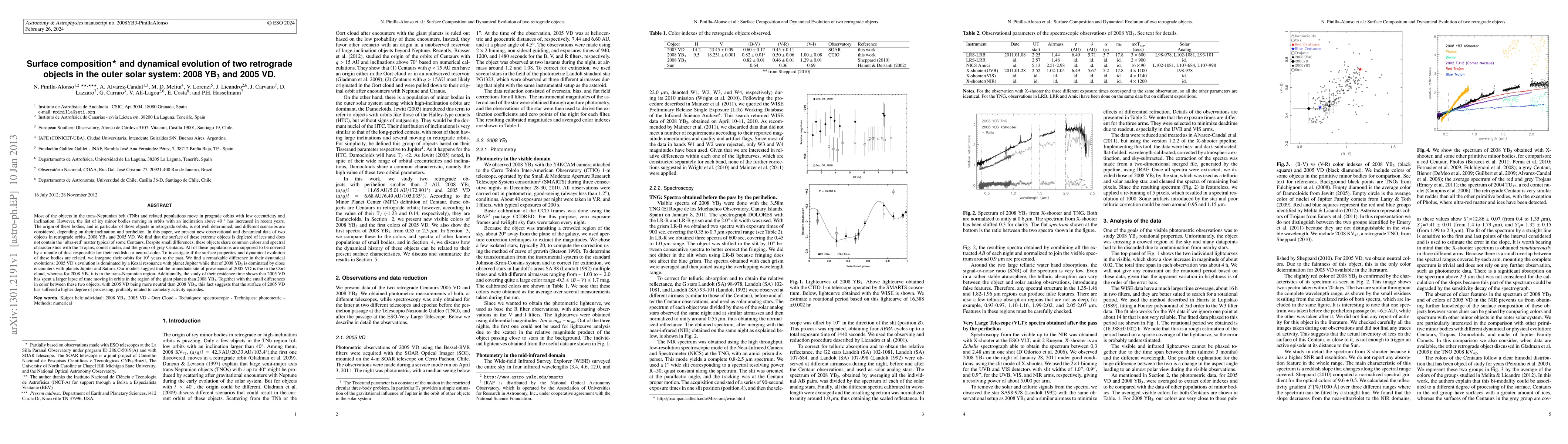 Most of the objects in the trans-Neptunian belt (TNb) and related populations move in prograde orbits with low eccentricity and inclination. However, the list of icy minor bodies moving in orbits with an inclination above 40 deg. has increased in recent years. The origin of these bodies, and in particular of those objects in retrograde orbits, is not well determined, and different scenarios are considered. In this paper, we present new observational and dynamical data of two objects in retrograde orbits, 2008 YB3 and 2005 VD. We find that the surface of these extreme objects is depleted of ices and does not contain the 'ultra-red' matter typical of some Centaurs. Despite small differences, these objects share common colors and spectral characteristics with the Trojans, comet nuclei, and the group of grey Centaurs. All of these populations are supposed to be covered by a mantle of dust responsible for their reddish- to neutral-color. To investigate if the surface properties and dynamical evolution of these bodies are related, we integrate their orbits for 10^(8) years to the past. We find a remarkable difference in their dynamical evolutions: 2005 VD' s evolution is dominated by a Kozai resonance with planet Jupiter while that of 2008 YB3 is dominated by close encounters with planets Jupiter and Saturn. Our models suggest that the immediate site of provenance of 2005 VD is the in the Oort cloud, whereas for 2008 YB3 it is in the trans-Neptunian region. Additionally, the study of their residence time shows that 2005 VD has spent a larger lapse of time moving in orbits in the region of the giant planets than 2008 YB3. Together with the small differences in color between these two objects, with 2005 VD being more neutral than 2008 YB3, this fact suggests that the surface of 2005 VD has suffered a higher degree of processing, probably related to cometary activity episodes.