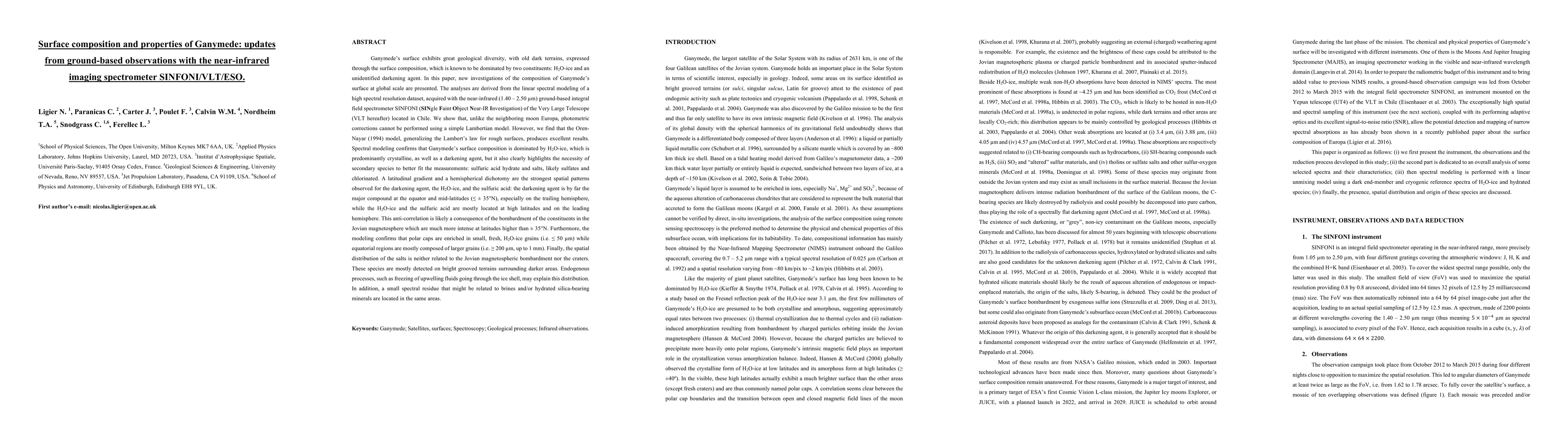 This paper uses SINFONI/VLT observations to analyze Ganymede's surface composition, revealing a dominance of H2O-ice and a darkening agent, likely sulfuric acid hydrate and salts. Spatial patterns show a latitudinal gradient and hemispherical dichotomy, with the darkening agent prevalent at lower latitudes and H2O-ice and sulfuric acid at higher latitudes.